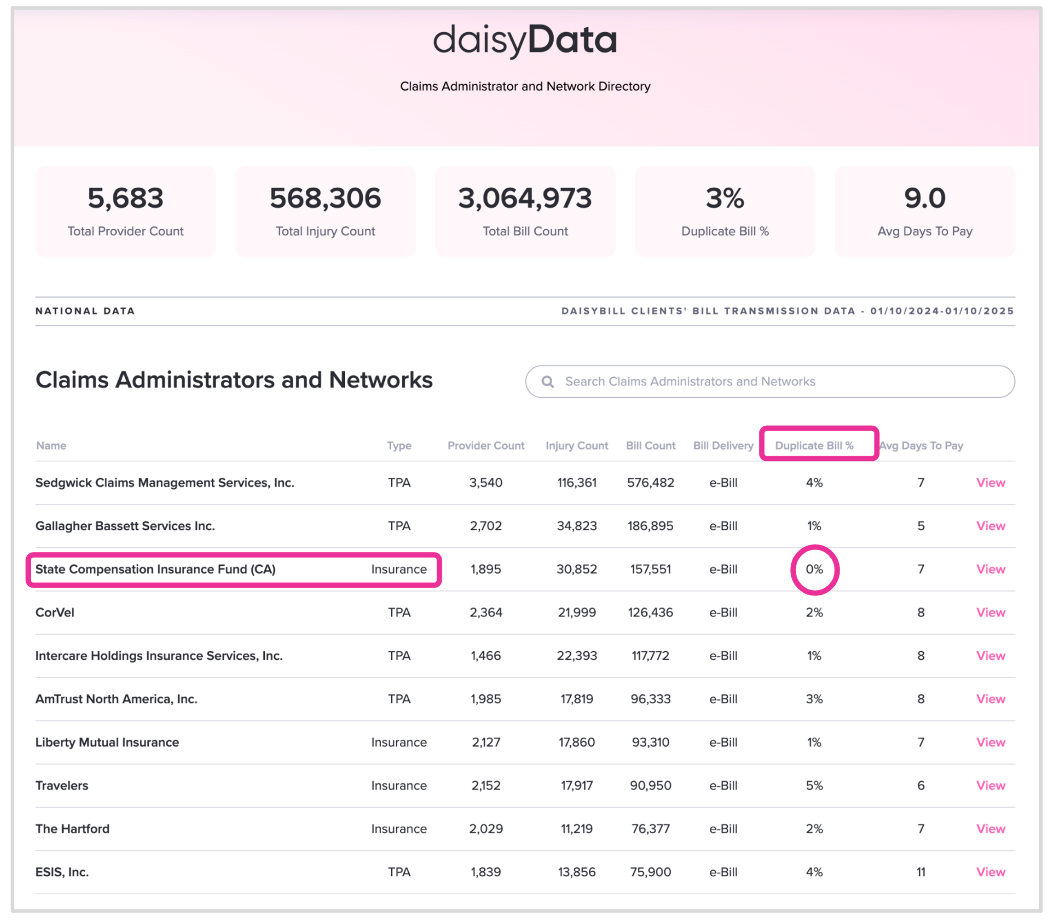 On our website, daisyBill maintains a Claims Administrator and Network Directory that reports the number of duplicate bills transmitted to each claims administrator (aka payer) and network in the preceding 365 days. This data is updated daily.