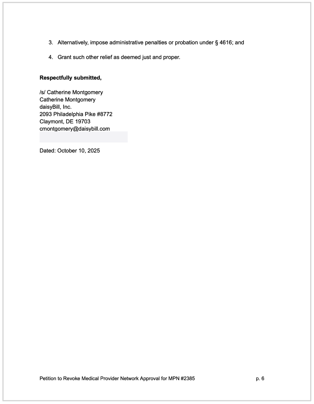 On October 10, 2025, daisyBill submitted a formal petition (below) to revoke approval for the CCMSI/First Health CompAmerica Select Network MPN (ID #2385).