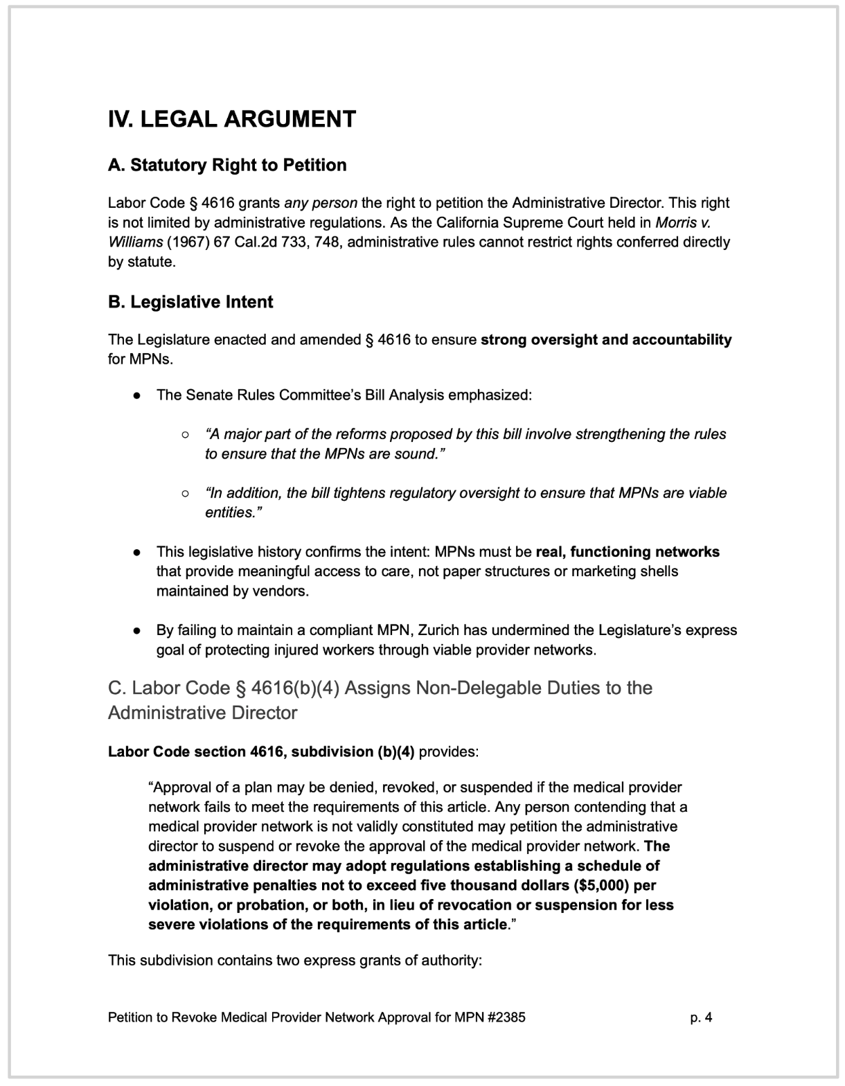 The petition details how this MPN violates California law, specifically LAB § 4616, as outlined in the table below.
