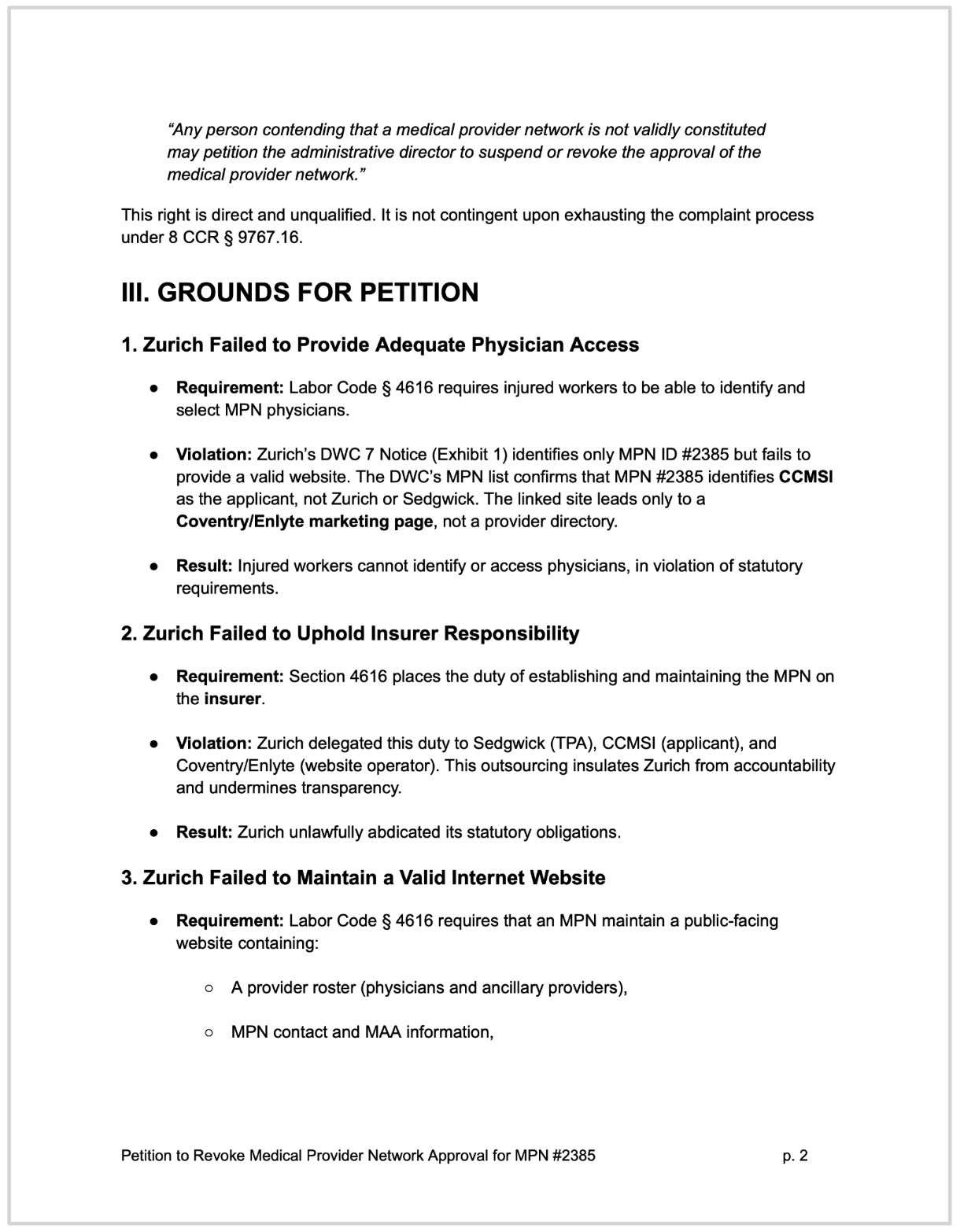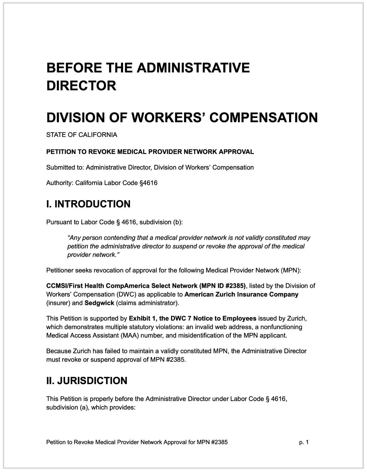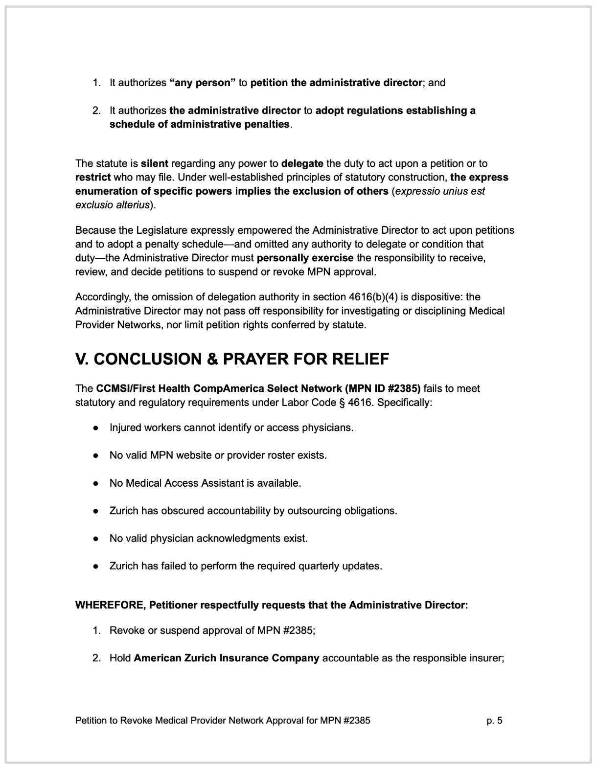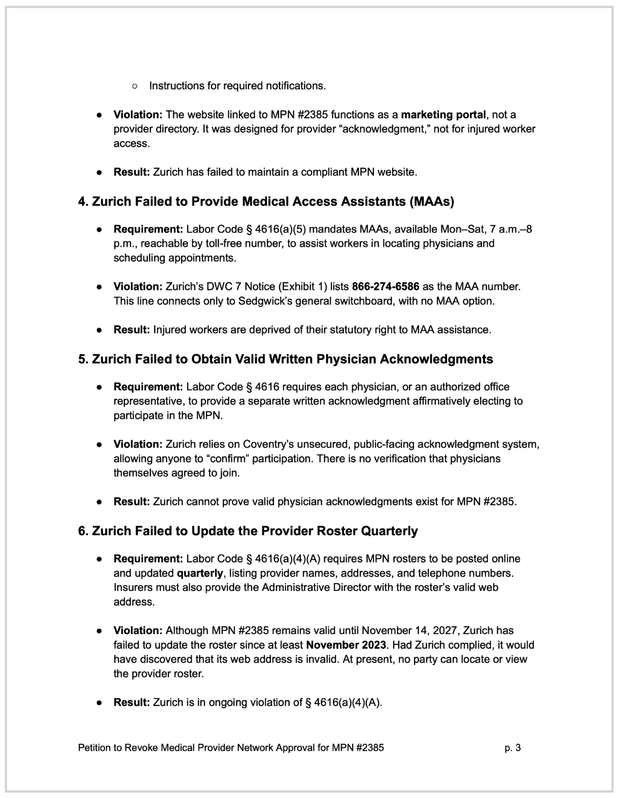 Our petition, pursuant to state Labor Code (LAB) Section 4616, demands the CA DWC revoke approval for the CCMSI / First Health CompAmerica Select Network (Zurich’s MPN, ID #2385). This MPN is a catalog of non-compliance, which: