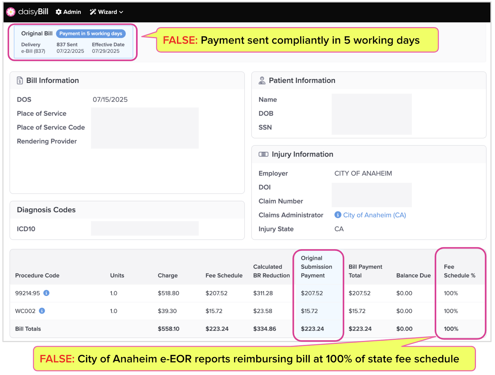 Anaheim’s inaccurate e-EOR was posted automatically to the provider’s system, incorrectly indicating that the bill was resolved at full fee schedule rates. This invalid payment data: