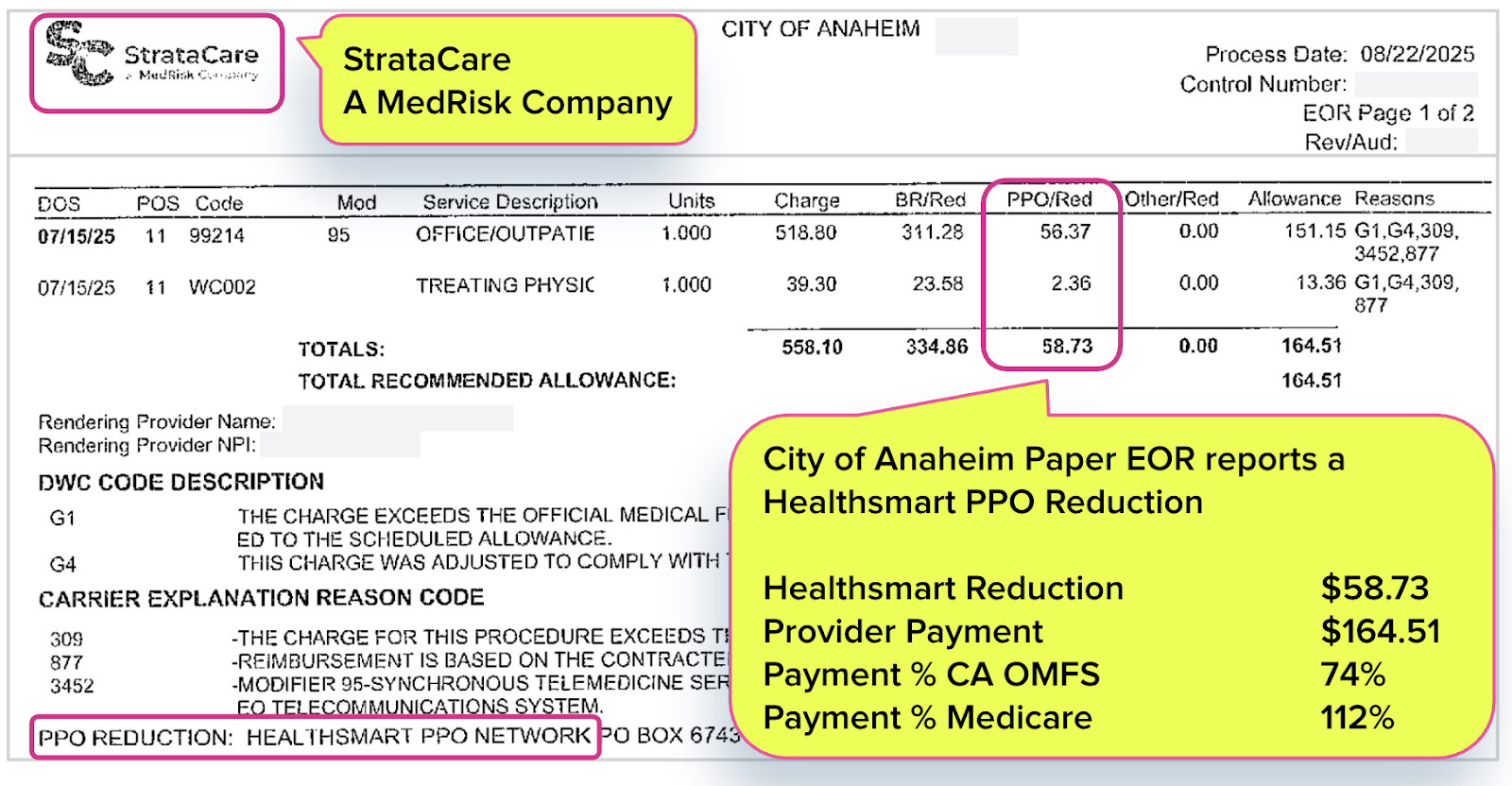 The EOR listed a Healthsmart Preferred Provider Organization (PPO) as the source of the payment discount. The doctor claims never to have signed any such PPO contract (daisyBill will send a letter to Anaheim requesting proof of this contract).