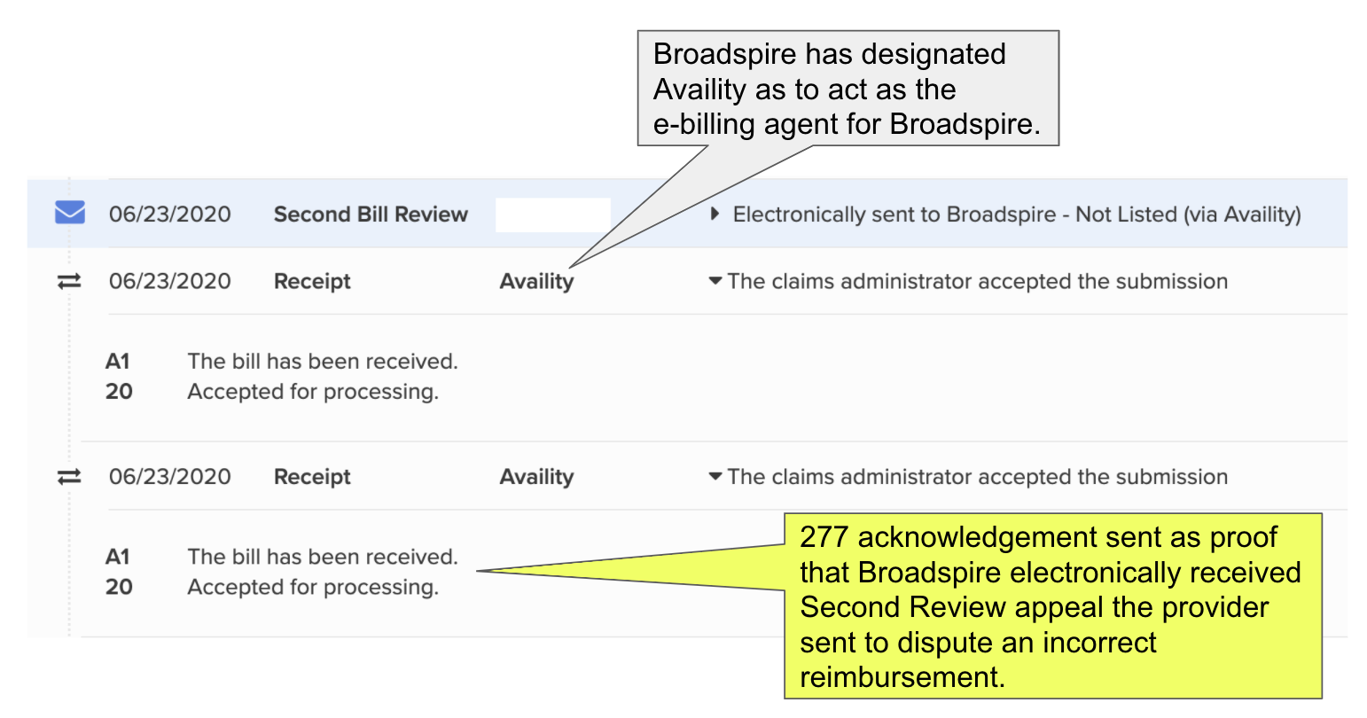 On 8/14/2020, Broadspire, through Availity, finally responded to DaisyBill with the message that Broadspire cannot accept Second Reviews electronically. Broadspire defies California law and is imposing two requirements that are directly opposite of what the law states. According to Availity, Broadspire is requiring that: