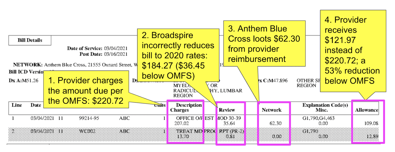 Broadspire is out of compliance in applying outdated reimbursement rates to the wrong dates of service. Just as infuriating is the technically compliant — but baseless — gift of the provider’s revenue from Broadspire to Anthem Blue Cross.