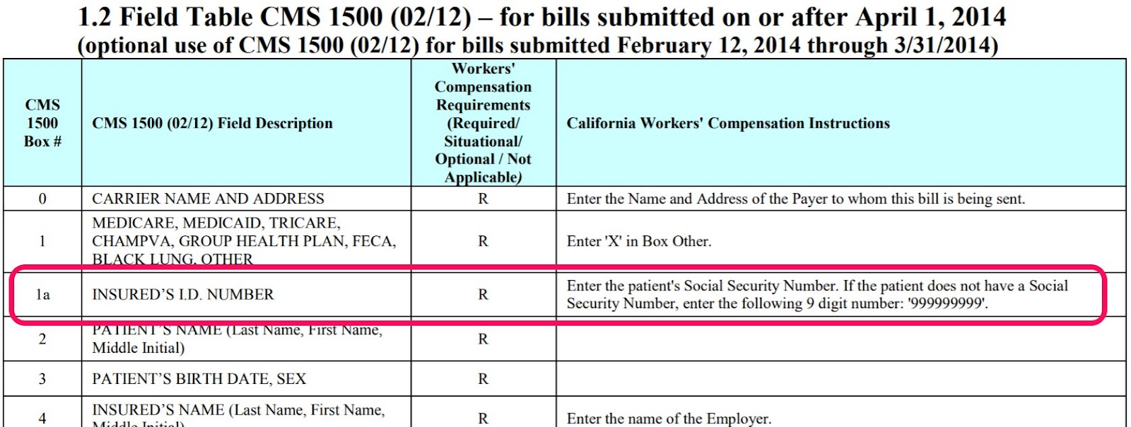 As shown, the field description for box 1a is “INSURED’S I.D. NUMBER.” While this number may vary from state to state, the DWC guide is unambiguous about what California providers must do: “Enter the patient’s Social Security Number,” or in the absence of an SSN, enter 999999999.