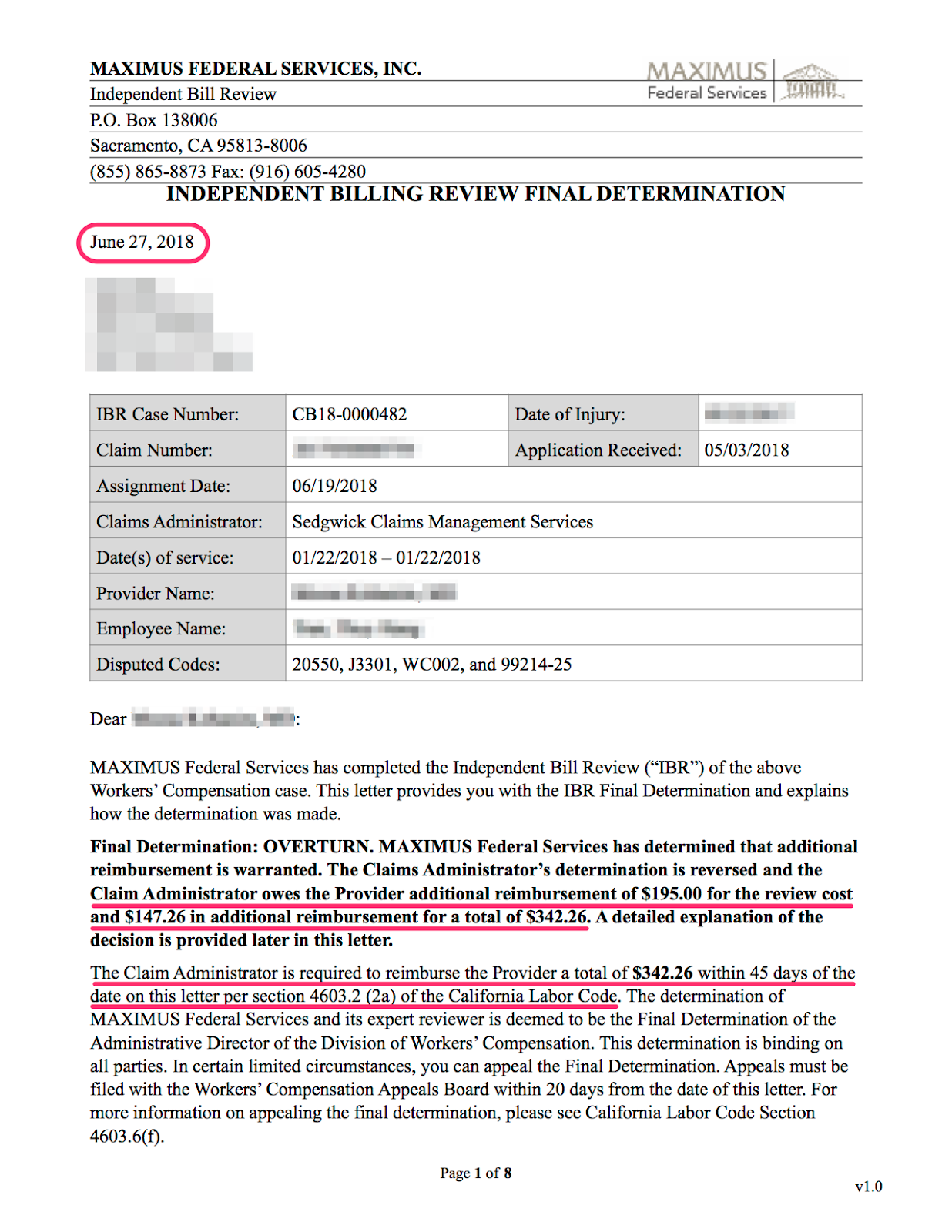 Following complaints from some of our providers, we discovered several cases of claims administrators failing to remit payment within the mandated timeframe. According to California Labor Code Section 4603.2, claims administrators have 45 days to pay, from the date on the letter Maximus sends to the claims administrator announcing the IBR decision.