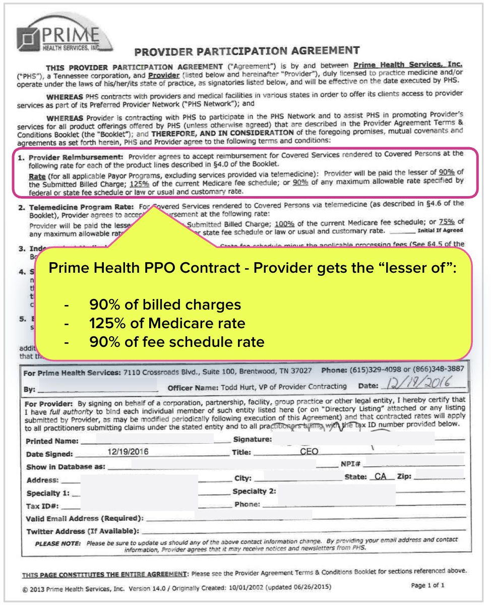 PPO contracts typically cap provider reimbursement at the “lesser of” several options. The Prime Health Services PPO contract below is a perfect example. Under it, the provider receives the lesser of: