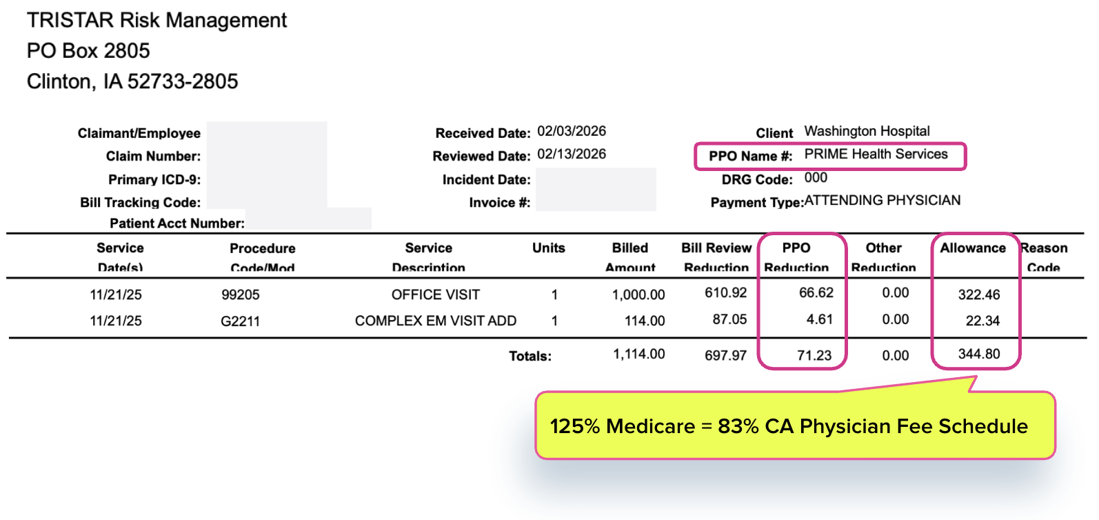 Below is an Explanation of Review issued under the Prime Health Services contract above. Tristar Risk Management paid 125% of the Medicare rate (the "lesser of" the three contractual options) for services the provider billed at the California Physician Fee Schedule rate.