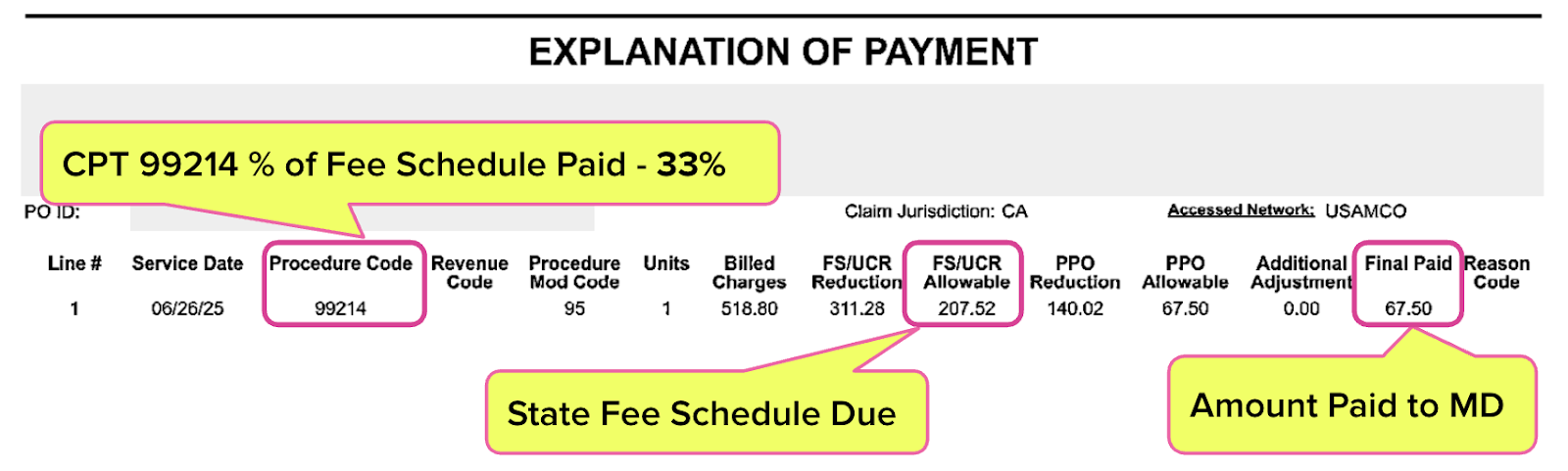 The EOR above is not an isolated example. Our CA State Fee Schedule vs Provider Reimbursement website page features live payment data daisyBill collects, analyzes, and publicizes.