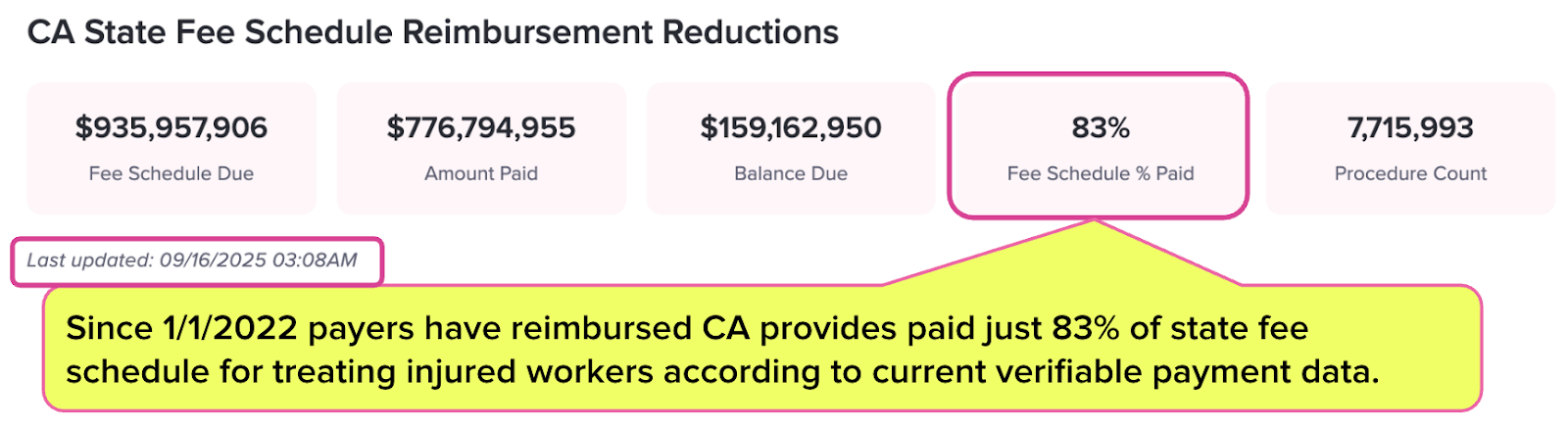 Even worse, daisyData from millions of workers’ comp bills confirm that claims administrators routinely pay California providers less than those already-low fee schedule rates.
