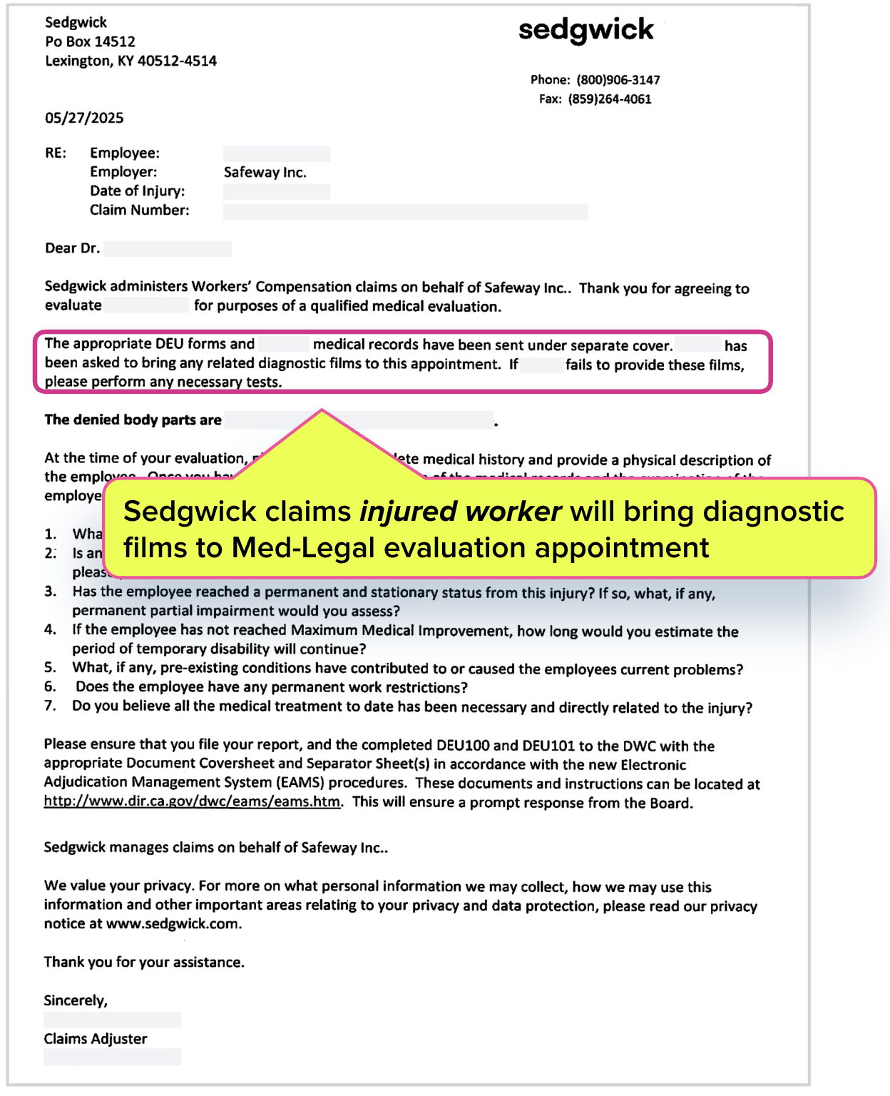 Recently, Sedgwick Claims Management Services, Inc. sent a daisyCollect Med-Legal evaluator a letter claiming that the injured worker would bring “any related diagnostic films” to the Medical-Legal evaluation appointment.
