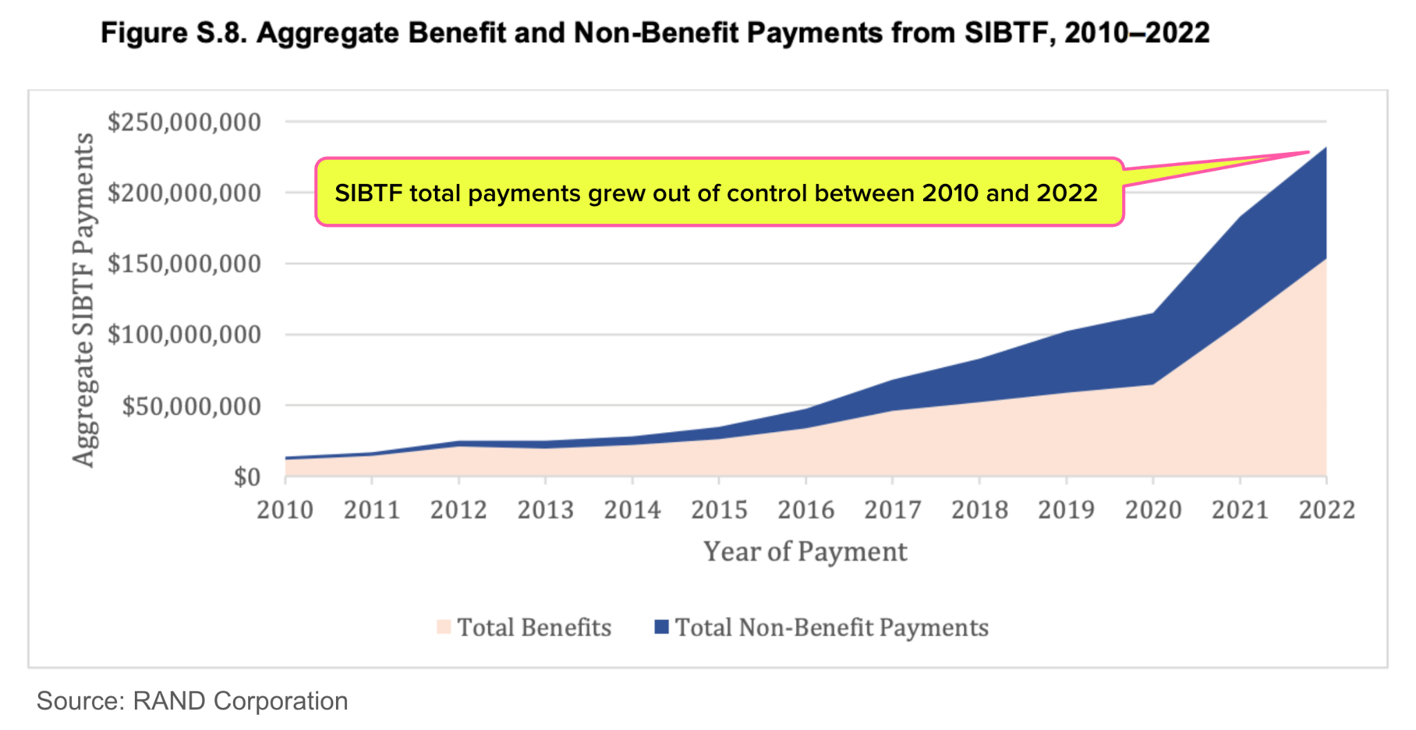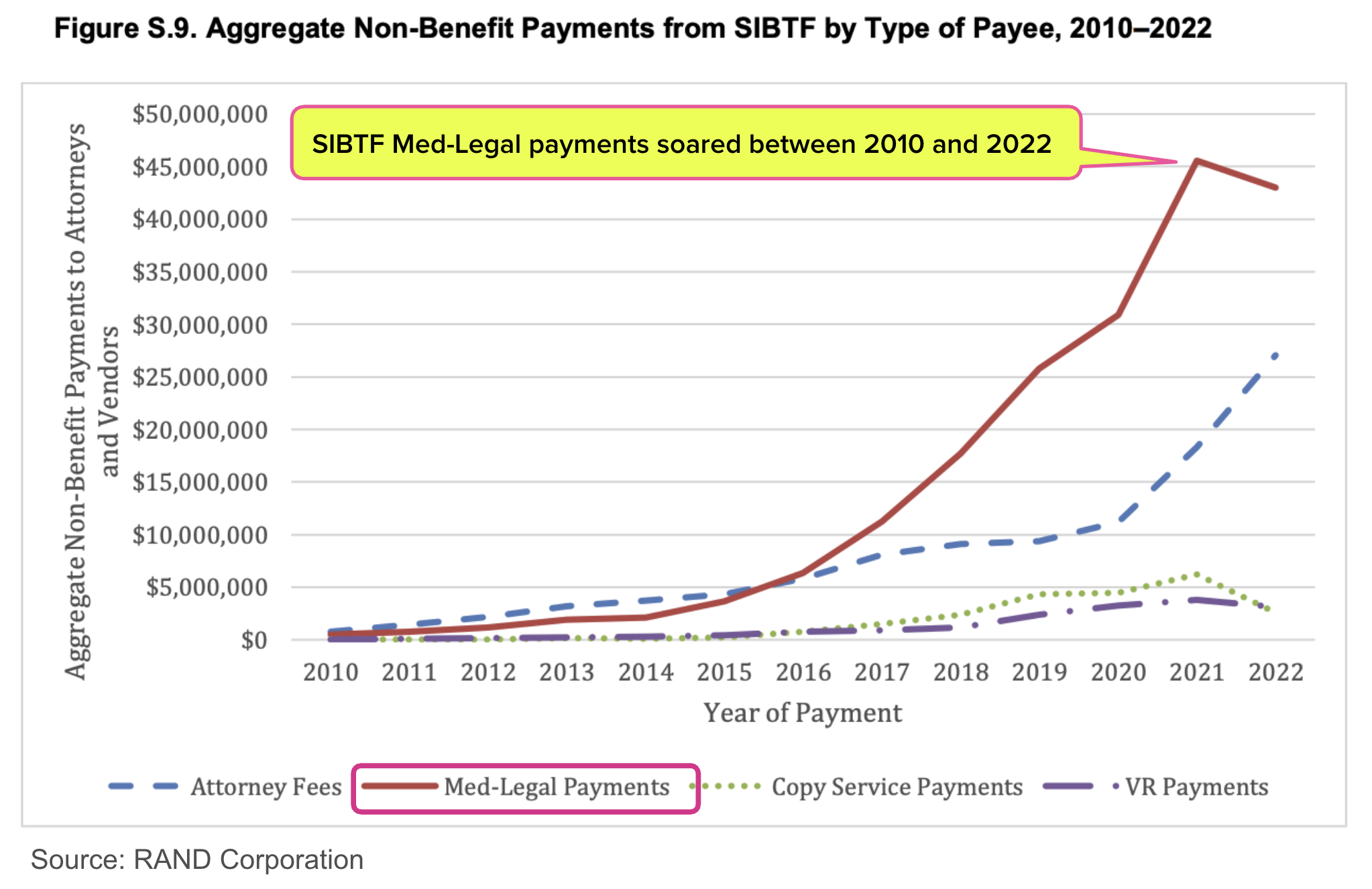 Under the CA DWC management, according to the RAND report, aggregate annual SIBTF Medical-Legal payments grew from $492,000 in 2010 to $43 million in 2022, an increase of nearly 9,000%.