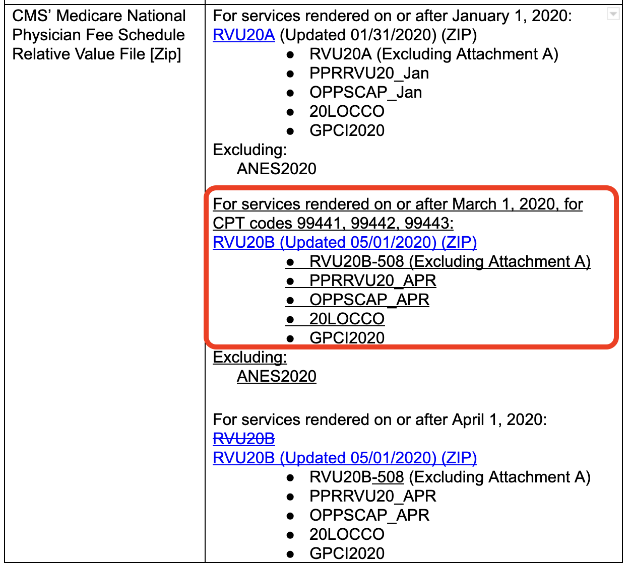 For California workers’ comp telehealth services, the 5/7/2020 Administrative Director Order adopted increased reimbursements for CPT codes 99441 through 99443, effective retroactively for all dates of service on or after 3/1/2020. In § 9789.19, the Physician and Non-Physician Practitioner Fee Schedule adopts the increased Relative Value Files used by CMS for these CPT codes.