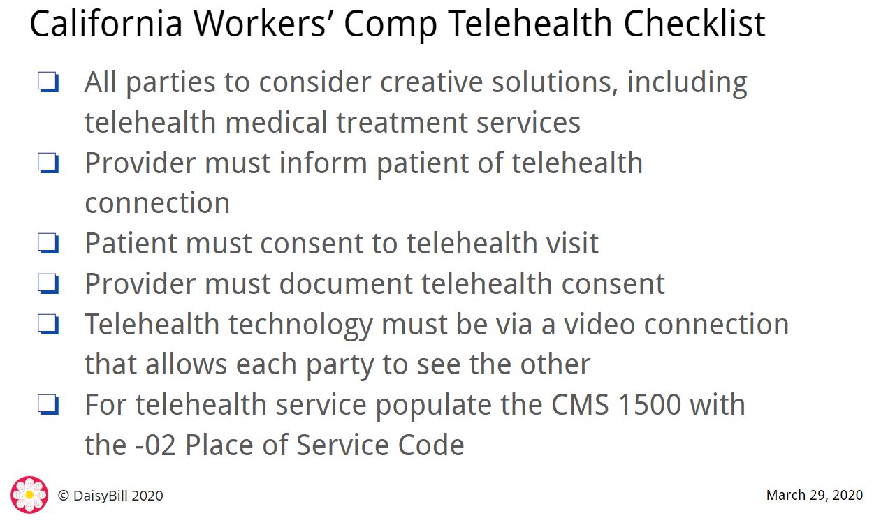 To date, the DWC has issued a number of Newslines addressing telehealth. From these DWC Newslines DaisyBill created a Workers’ Comp Telehealth Checklist that details all of the current Californian workers’ comp rules and regulations that apply when a provider furnishes medical treatment via telehealth.