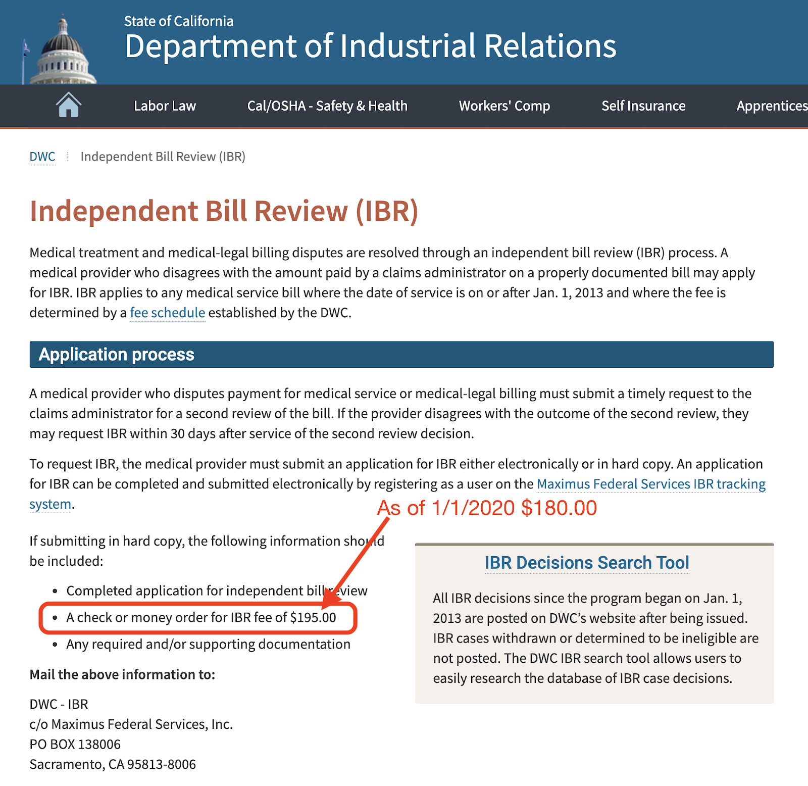 If this comes as a surprise to you, you’re not alone. The Division of Workers’ Compensation (DWC) has designated Maximus Federal Service as its independent bill reviewer, but Maximus has made little effort to spread the word — even as providers continued to pay the original, incorrect IBR filing fee amount.