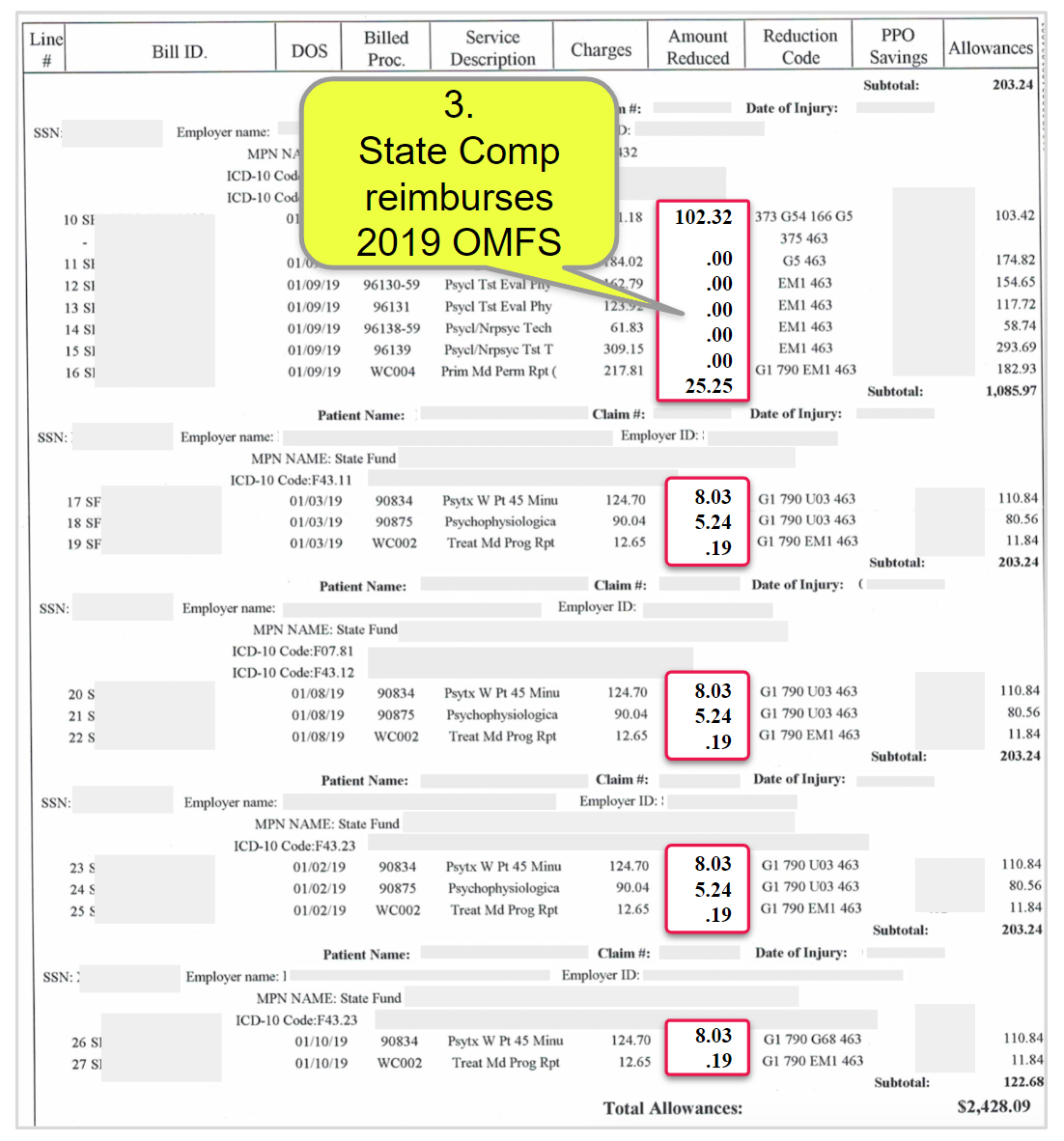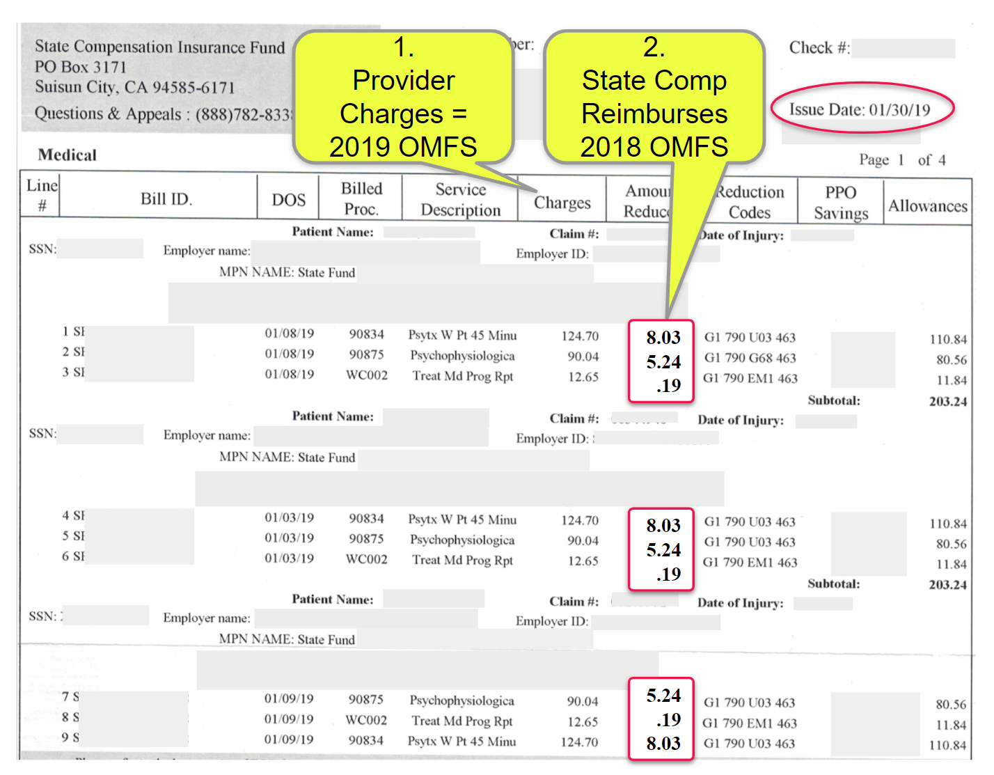 Some payers may attempt to dismiss their widespread 2019 underpayment by citing a “glitch” or other vague excuse. However, in the case of SCIF, there is clear evidence that demonstrates SCIF is aware of and has the ability to apply the correct fee schedule reimbursement to 2019 bills. The example below is a single explanation of review (EOR) with multiple payments which SCIF issued on 1/30/19. Inexplicably, this EOR contains SEVEN INCORRECT 2018 reimbursements and ONE CORRECT 2019 reimbursement, the latter of which reveals that SCIF knows the correct 2019 OMFS reimbursement.