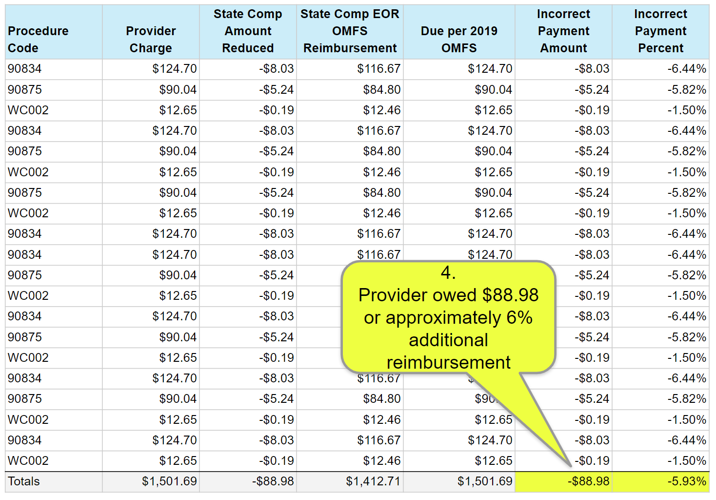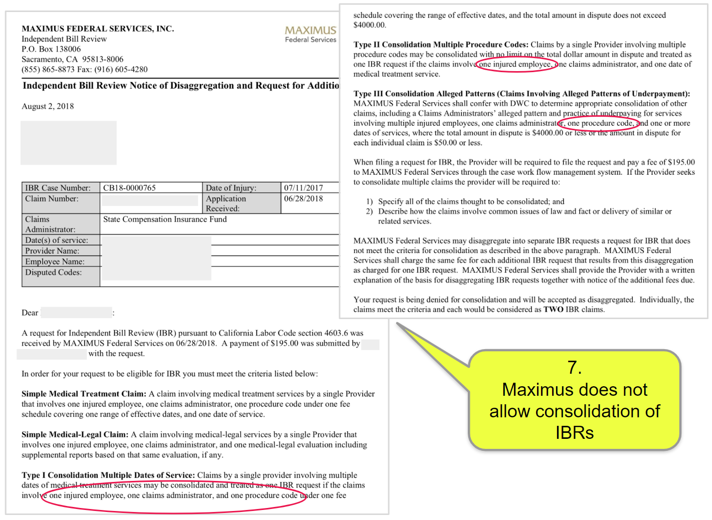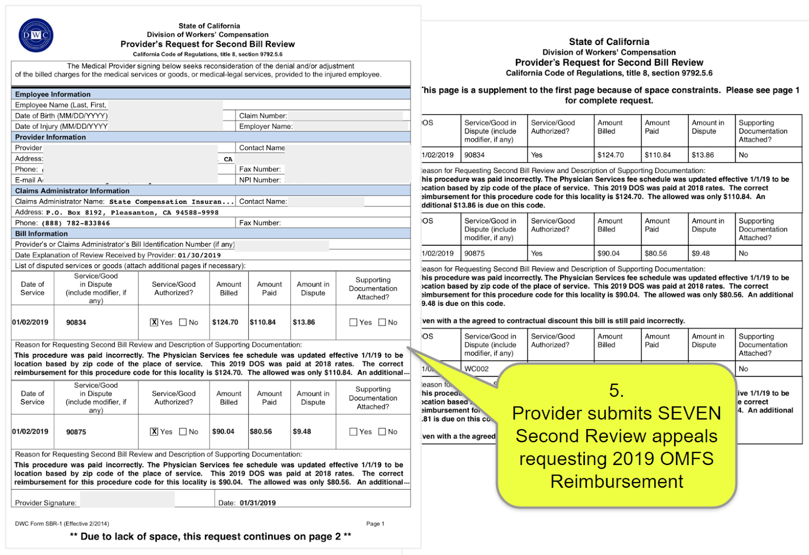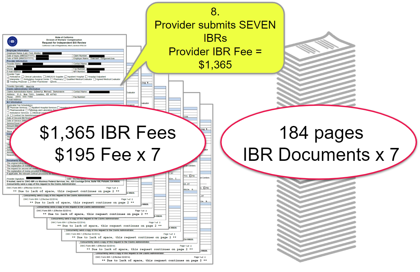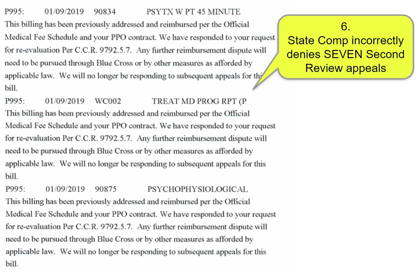 The provider appealed all seven incorrect reimbursements and SCIF denied all seven Second Review appeals, forcing the provider to appeal for correct 2019 payment by 1) requesting seven Independent Bill Reviews (IBRs) and 2) paying seven IBR filing fees.