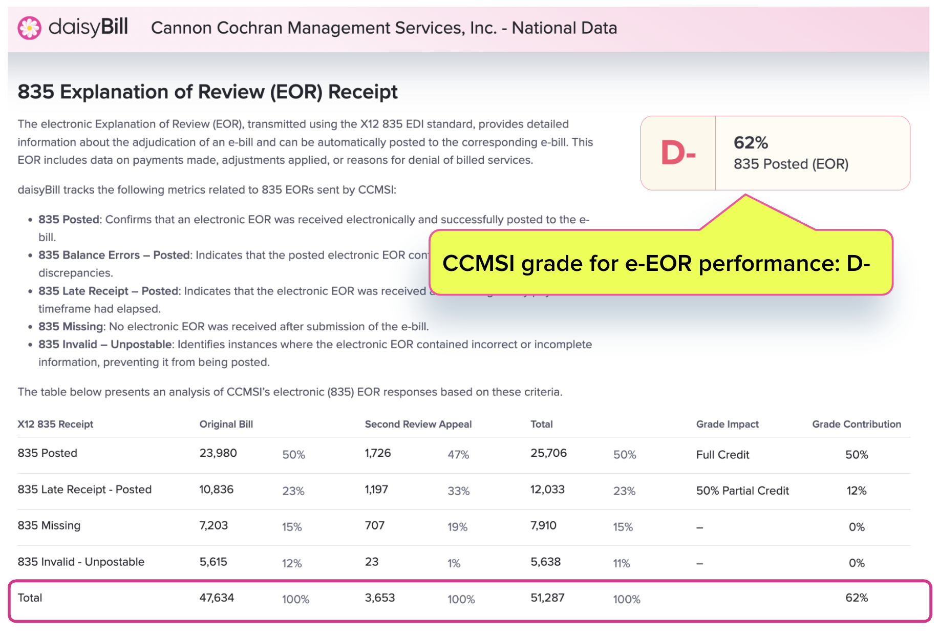 daisyData demonstrate that CCMSI's EDI performance is seriously off-track. With thousands of missing or invalid e-EORs, CCMSI's EDI score for e-EORs specifically is an appalling 62% (D-).