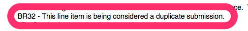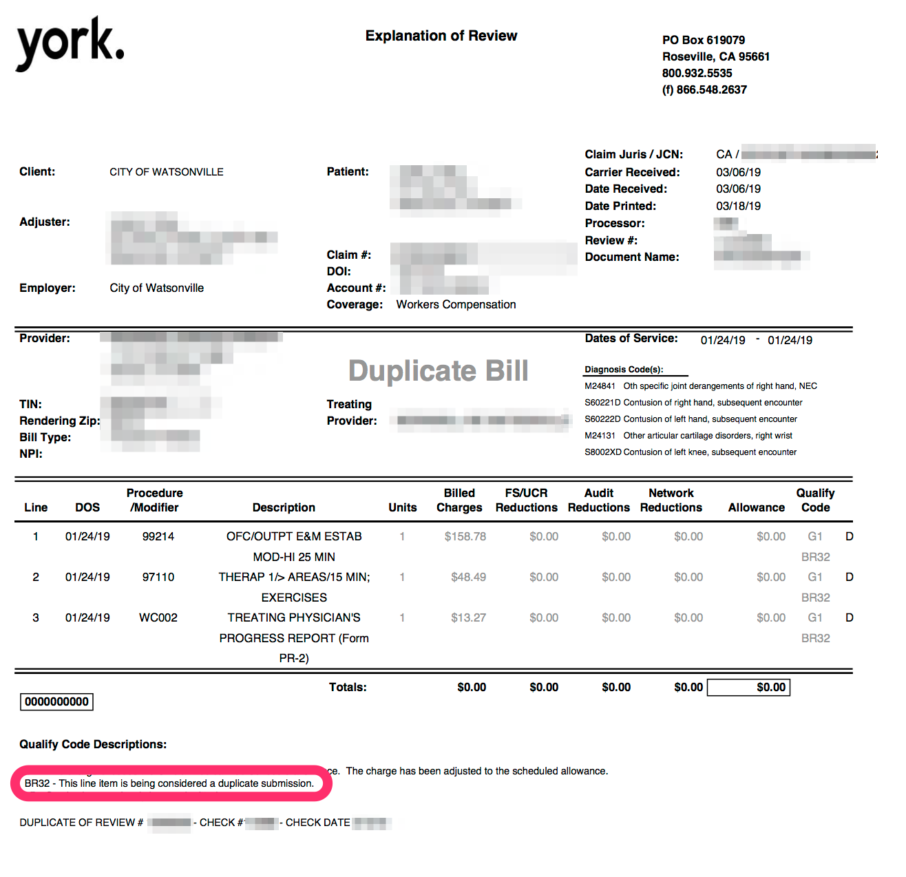 Typically, claims administrators that stand by the original denial of payment simply state as much, applying the appropriate BARC code to indicate that the original decision is upheld. But as in the final EOR below, York applied denial reasons indicating they “considered” the appeal a “duplicate submission”: