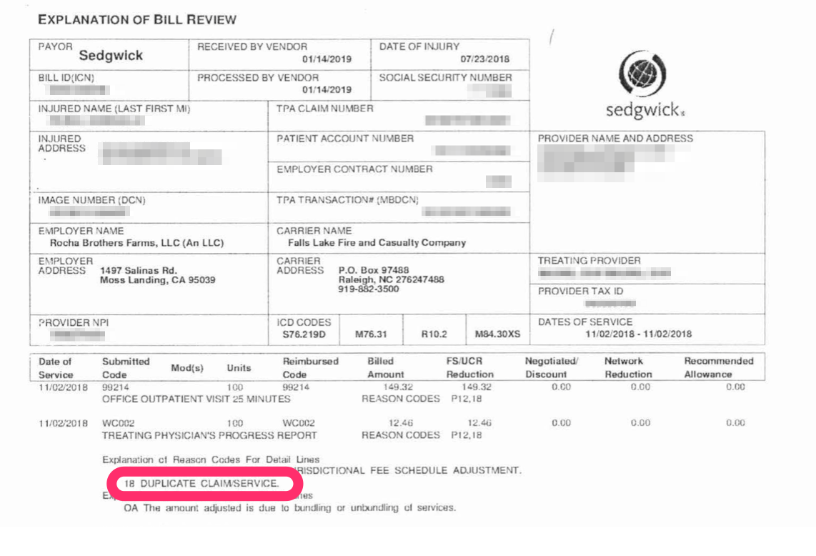 For example, claims administrators sometimes simply ignore second review appeals. In other cases, claims administrators insist on using the wrong year’s reimbursement rates, despite clearly being in possession of the correct reimbursement information. And of course, the likes of York and Sedgwick deny second review appeals as “duplicate” charges.