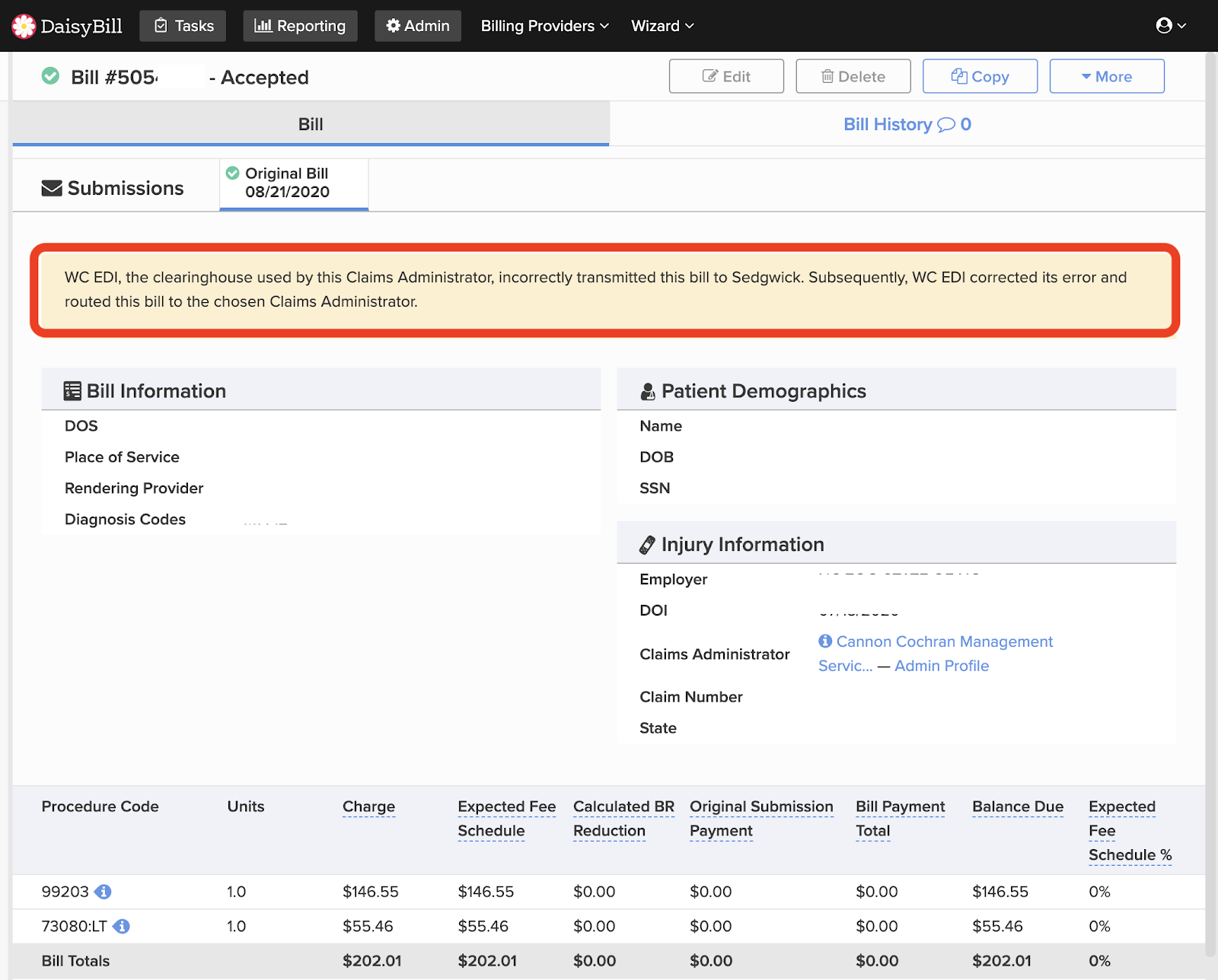 On behalf of our provider clients, DaisyBill contacted WorkCompEDI to determine the explanation (and the fix) for bills being routed to Sedgwick rather than the chosen claims administrator. WorkCompEDI explained that "an issue that caused a specific subset of bills to be resubmitted to Sedgwick incorrectly was determined and contained to a specific number of bills."