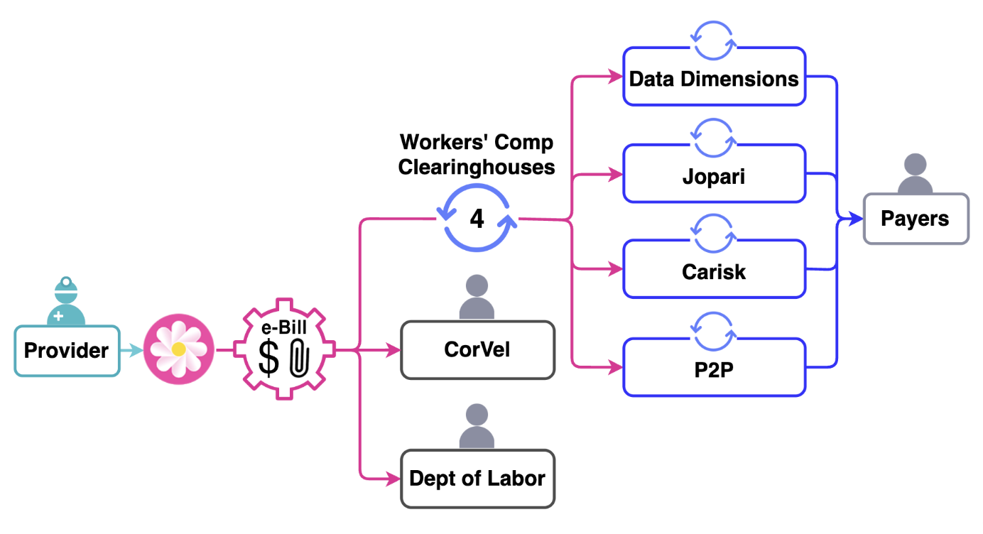 daisyBill’s proprietary network of direct electronic connections makes sure every e-bill is sent to the specific, designated clearinghouse that accepts e-bills on behalf of each payer. As illustrated below, our software also connects directly to the payers that do not use a clearinghouse, Third-Party Administrator CorVel, and the US Department of Labor.