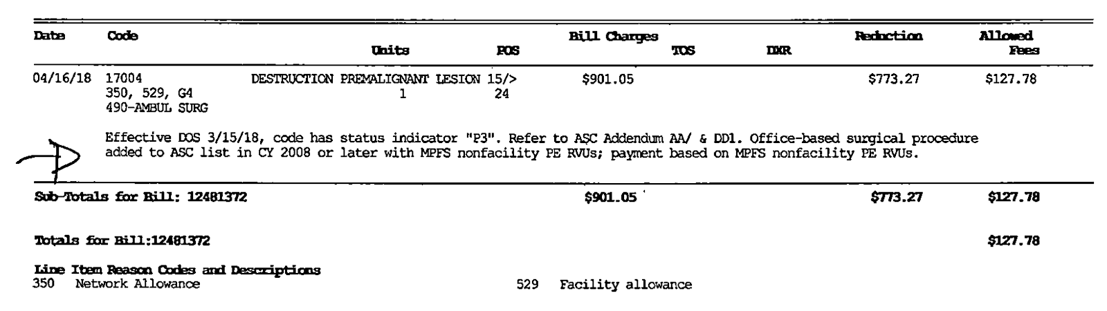 Multiple clients brought to our attention CorVel’s incorrect ASC adjudication and reimbursement practices. For example, the CorVel Explanation of Review (EOR) below incorrectly adjusts payment for the destruction of a premalignant lesion: