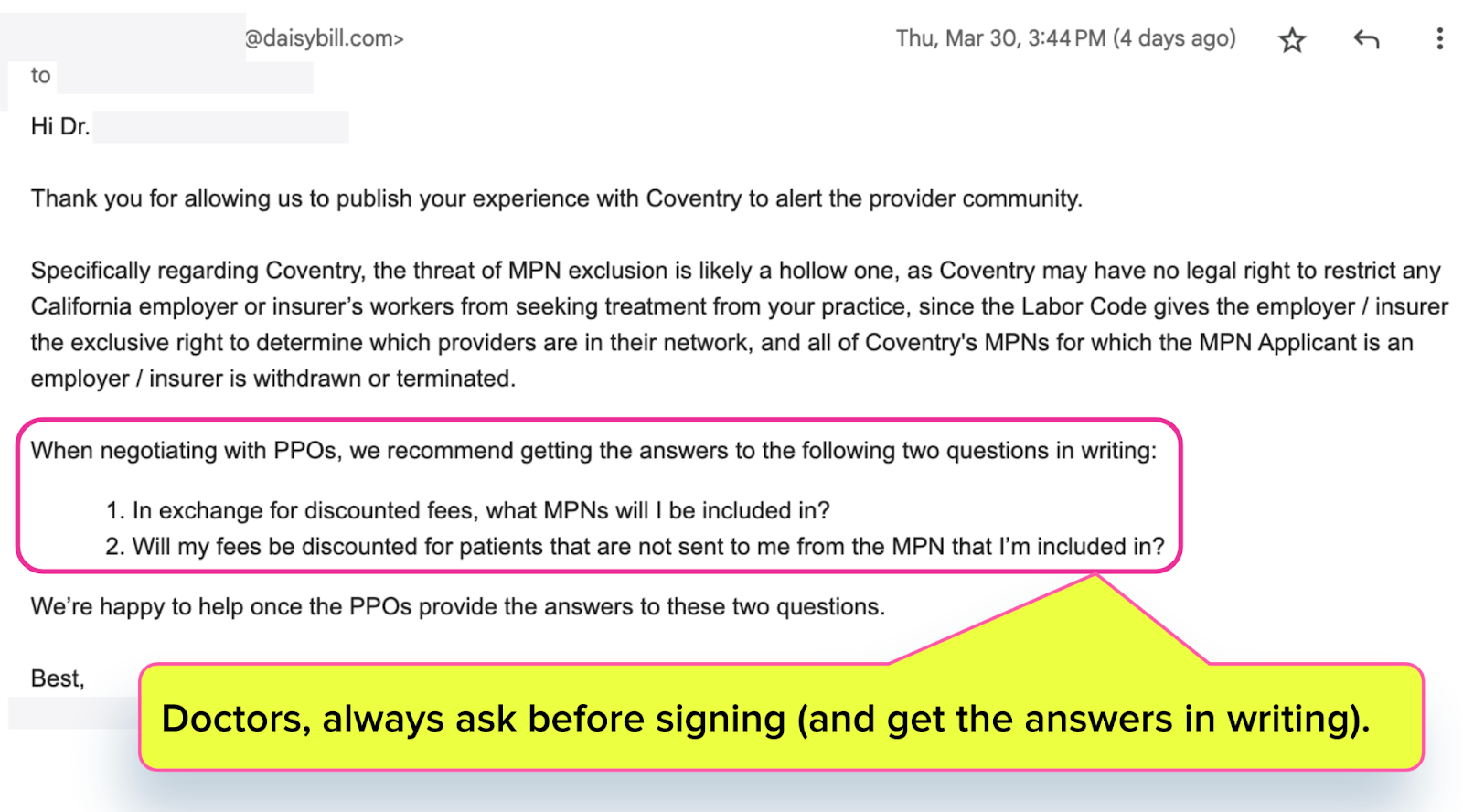 Following our recent webinar on MPNs and PPO discount contracts, the doctor reached out to daisyBill for information on navigating the negotiations with Coventry.
