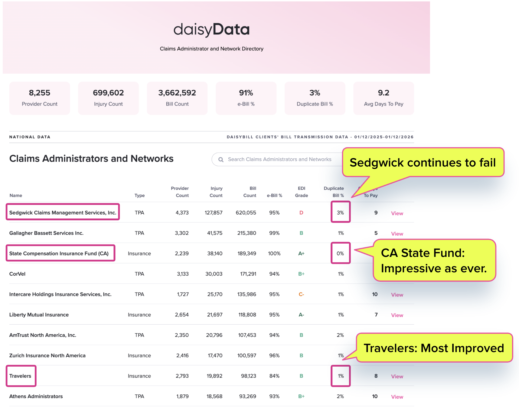 daisyBill’s Claims Administrator and Network Directory publicly documents the number of duplicate bills our clients send to each claims administrator (aka payer) and network in the preceding 365 days.