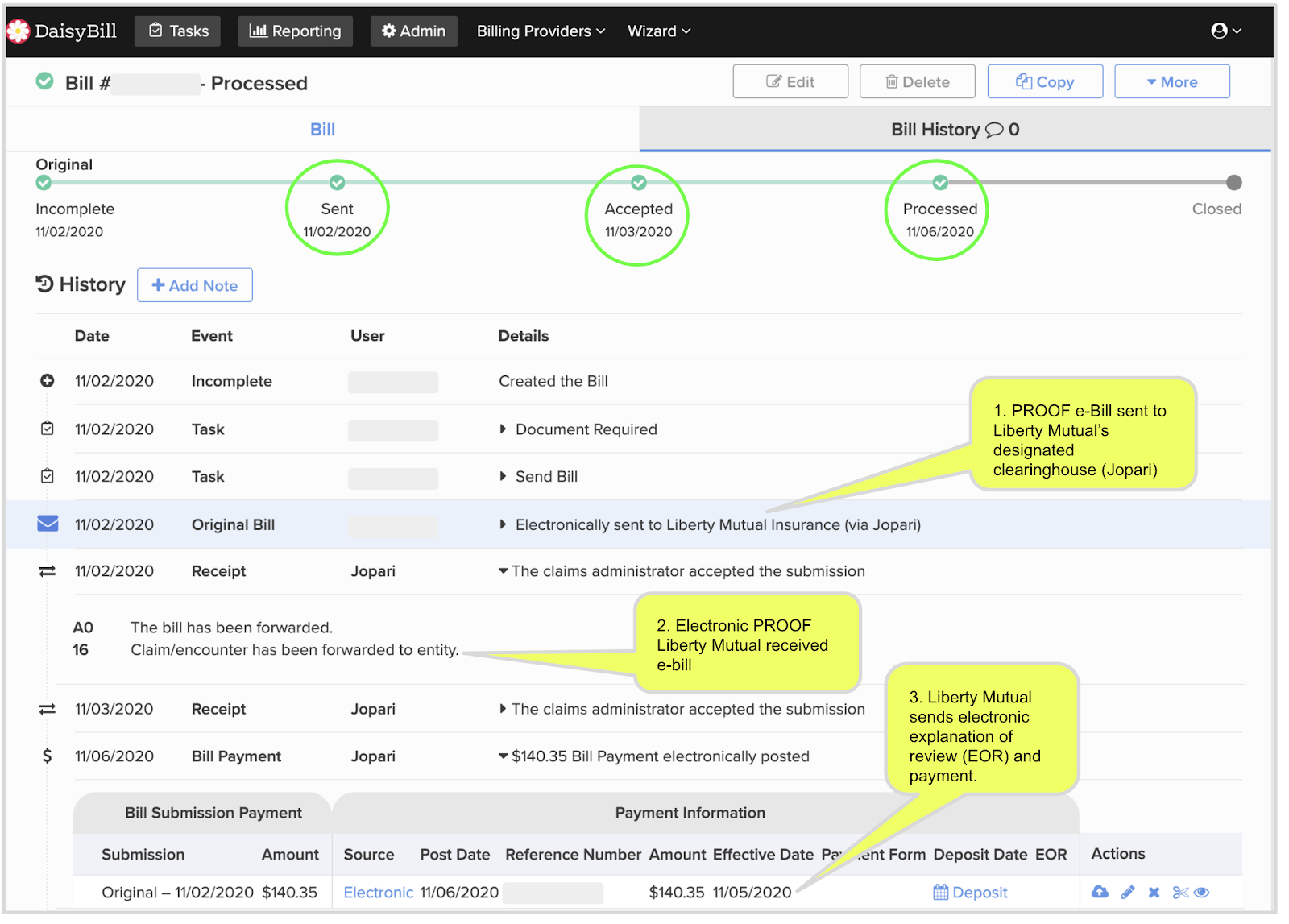For these providers that send e-bills, workers’ electronic transmission of bills generates an immense amount of trackable data, including precise data to prove that the claims administrator received the e-bill. DaisyBill diligently uses this electronic billing data to track and monitor payment statistics for all claims administrators.