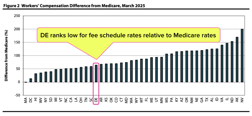 Data from a Workers’ Compensation Research Institute report, Designing Workers’ Compensation Medical Fee Schedules, underscores the need to take action to make workers’ comp financially sustainable for Delaware providers, with the state ranking 15th from the bottom among fee-schedule states.