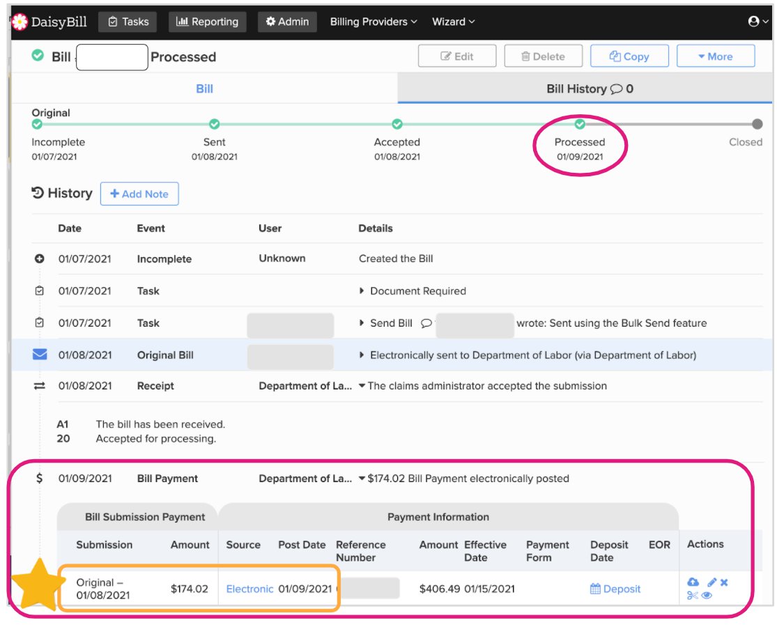 In fact, this new DOL system is so good that some electronic bills are processed in as little as one day. Below is an example of an electronic bill that DaisyBill sent to the DOL on January 8, 2021. The DOL processed this electronic bill and issued an electronic EOR on the NEXT day, January 9th.