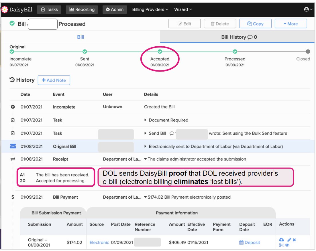 In October 2020, DaisyBill completed required testing with the DOL to be able to transmit providers’ e-bills directly to DOL. From the beginning, the DOL was able to process DaisyBillers’ workers’ comp bills in as little as a single day (For more details: Dept of Labor Billing Utopia: e-Bills Processed in ONE Day).