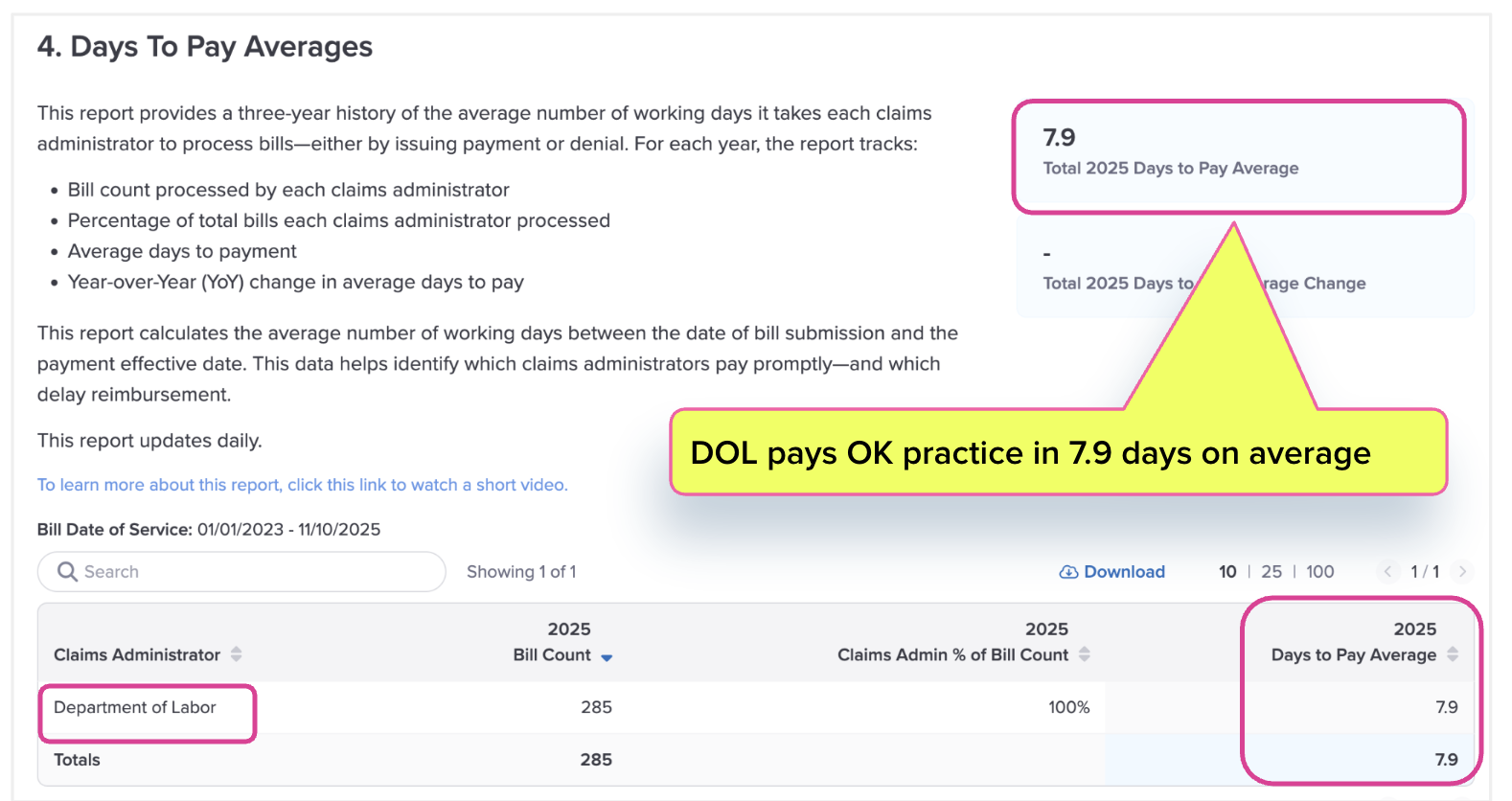 In October 2025, an Oklahoma occupational medicine practice began using daisyBill e-billing software to submit workers’ comp bills to the U.S. Department of Labor (DOL). Payment analytics reveal that since the practice implemented e-billing, the DOL pays its providers in 7.9 days on average.