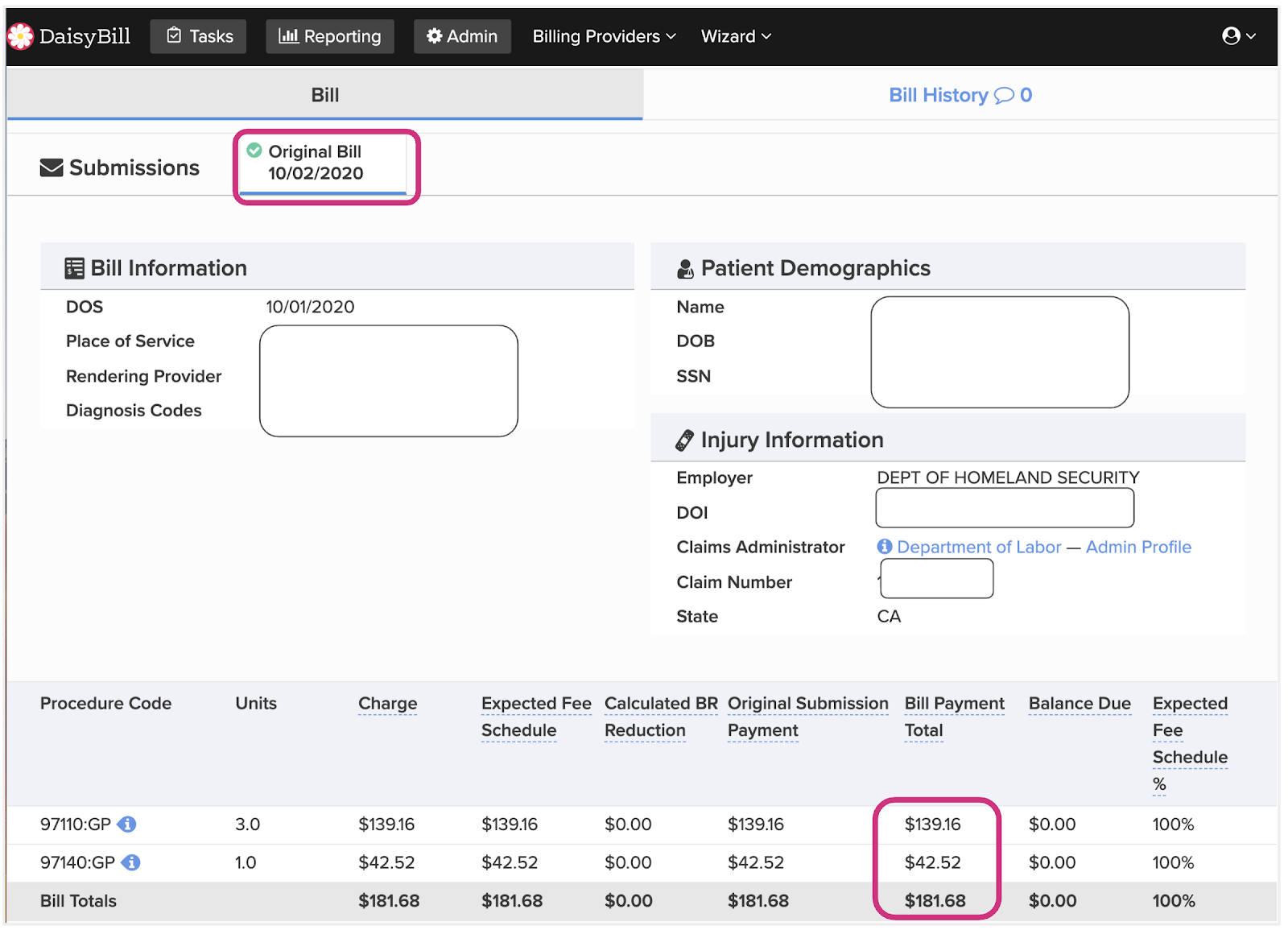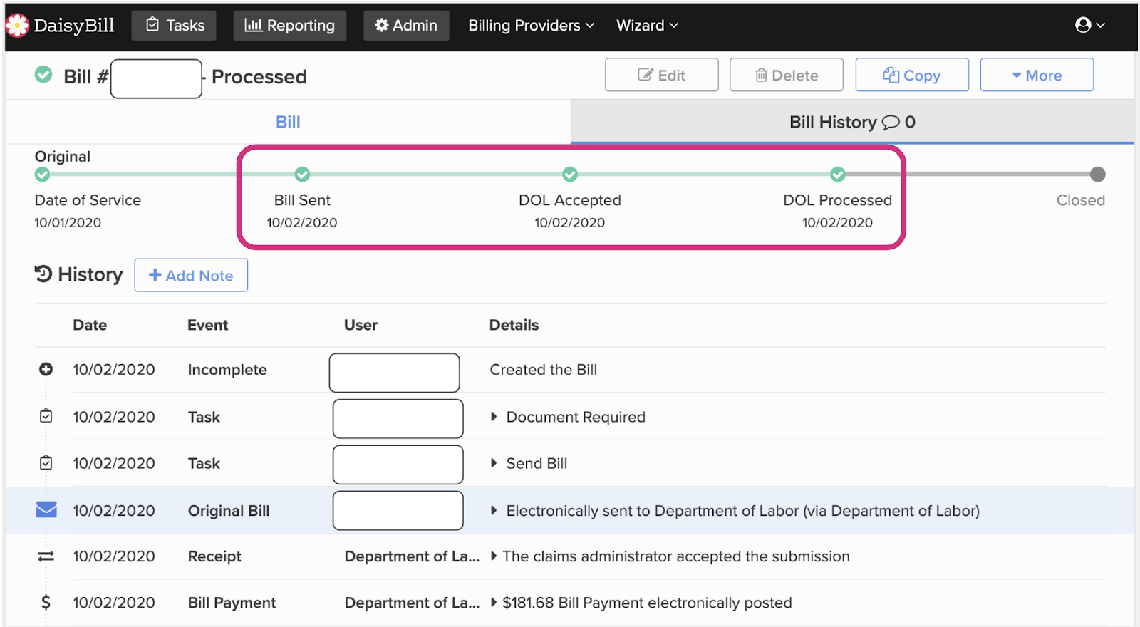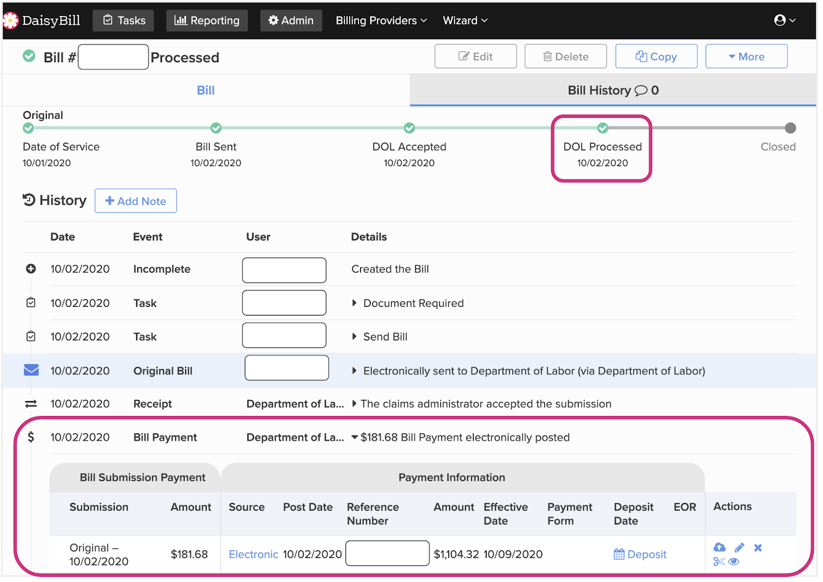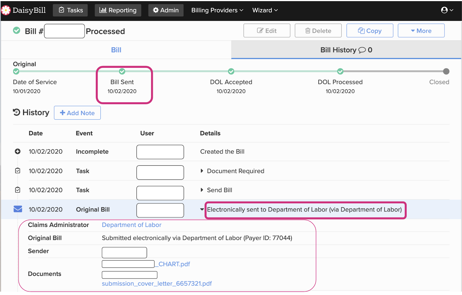 Below is an example of an electronic bill DaisyBill sent to the DOL on October 2nd. The DOL processed this electronic bill and issued an electronic EOR on the same day, October 2nd.