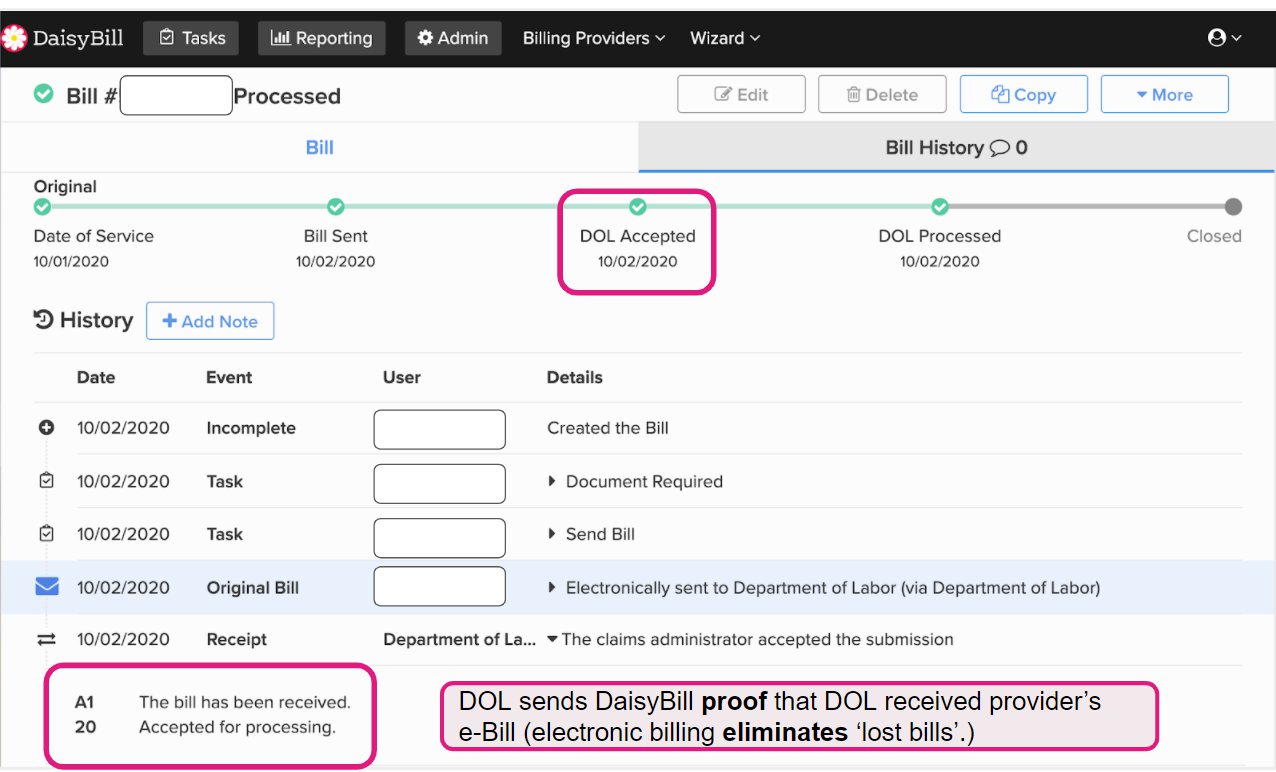 Once DaisyBill transmits the electronic bill, the DOL sends DaisyBill an acknowledgement verifying that the DOL received and will be processing the provider’s e-bill. This DOL receipt is how electronic billing eliminates those infuriating bills that are “lost in the mail.”