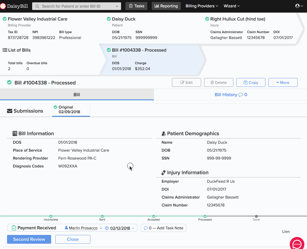 Our Bill history feature offers a complete lifecycle history of each and every one of our providers’ bills, from the moment of creation on. Every submission, every payment, and every task in between is accessible, along with any other relevant notes the provider adds.