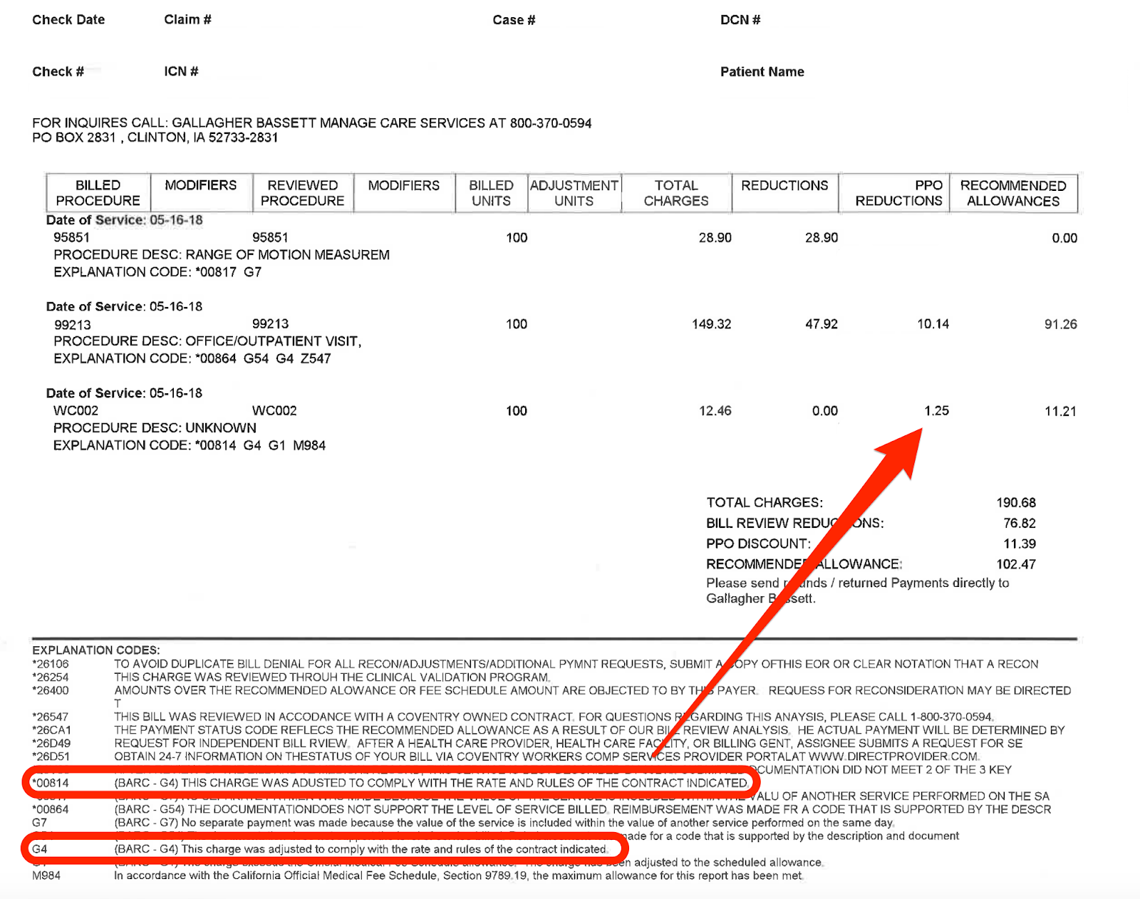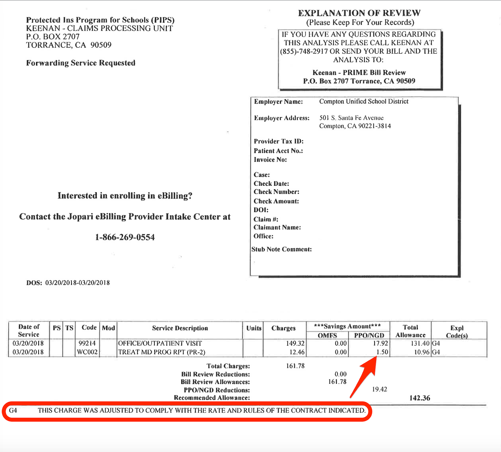 For 2018 dates of service, the Treating Physicians’ Progress Report is reimbursable at a rate of $12.46. As the Explanations of Review (EOR) below demonstrate, MPN discounts lop off between $1.25 and $1.50 per report.