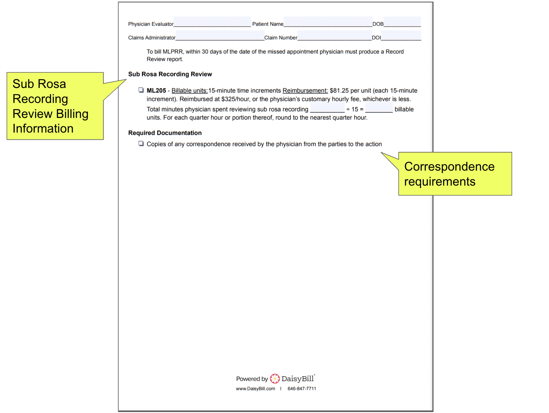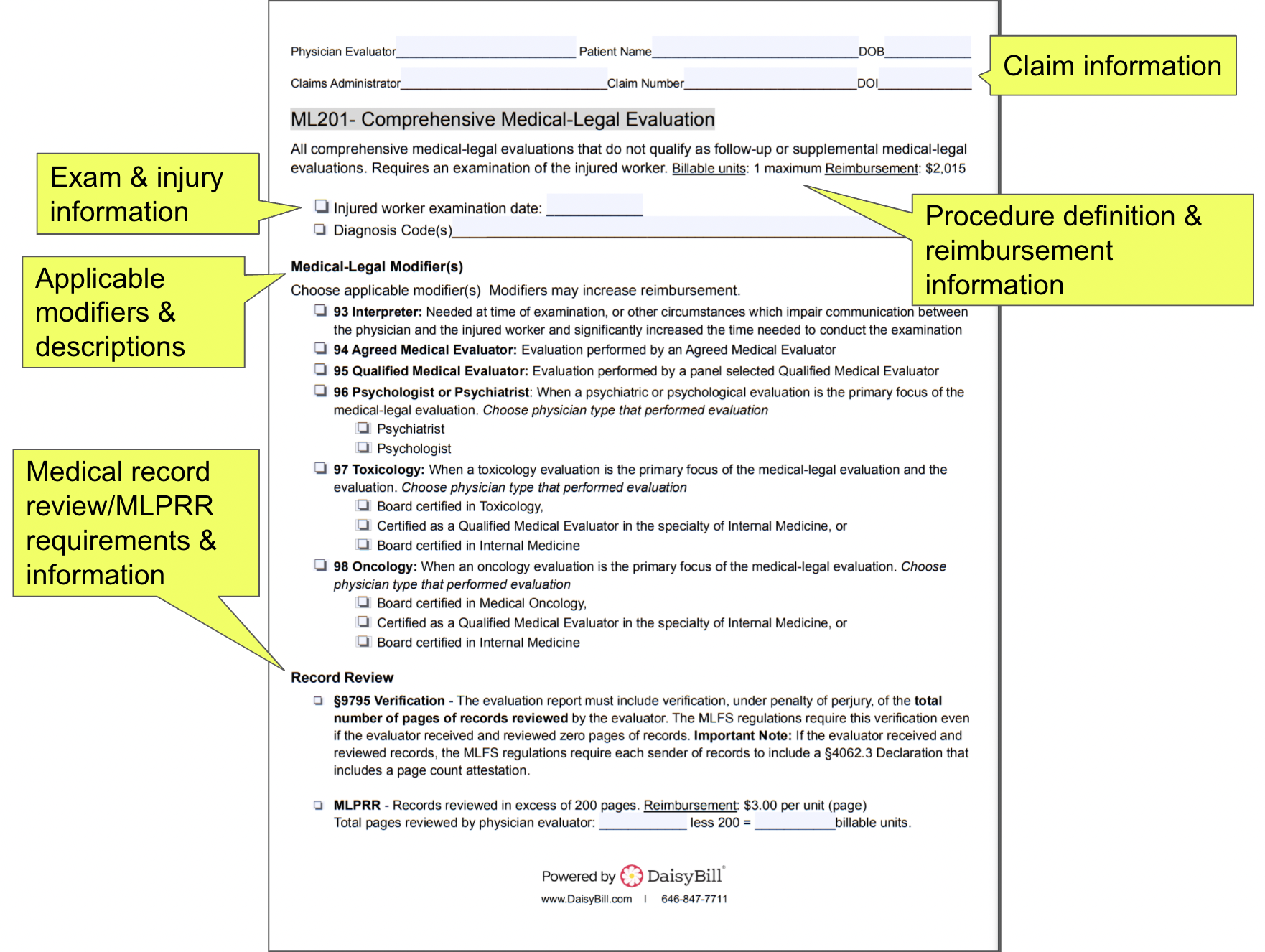 From noting the applicable modifiers, to including correspondence from the parties, to making sure every page of medical record review is properly accounted for, this ML201 Superbill is your roadmap to accurate compensation.