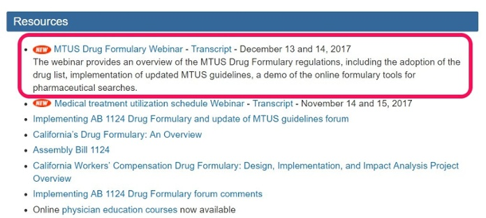 The Division of Workers' Compensation (DWC) posted a video replay of their recent webinar on the newly effective drug formulary. The DWC hosted the webinar in December, following the formulary's official state approval. For those who could not attend the webinar, the DWC initially posted a written transcript.