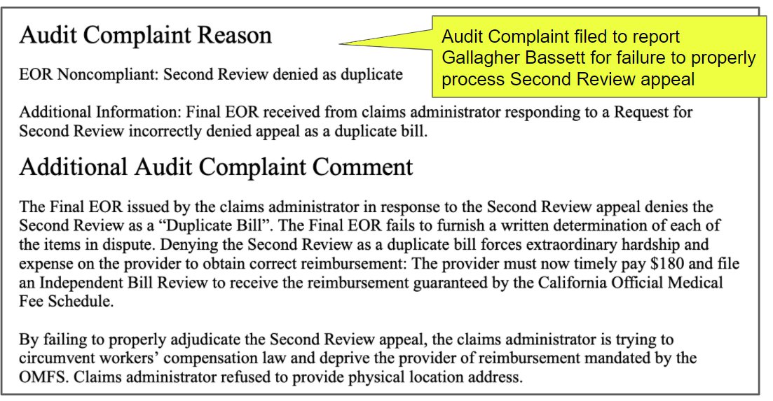 In a previous article, we demonstrated how Gallagher Bassett ignores the California-mandated workers’ comp Official Medical Fee Schedule (OMFS). Gallagher Bassett also ignores Second Review appeals sent by providers requesting the correct reimbursement.