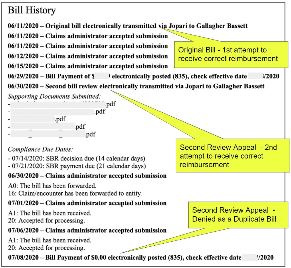 For a provider to receive correct reimbursement, Second Review appeals are just one of an escalating series of administrative hurdles that California law forces upon providers. It’s therefore particularly galling that after meeting all the criteria for a compliant Second Review appeal, a claims administrator ignores the appeal by incorrectly denying the appeal as a duplicate bill.