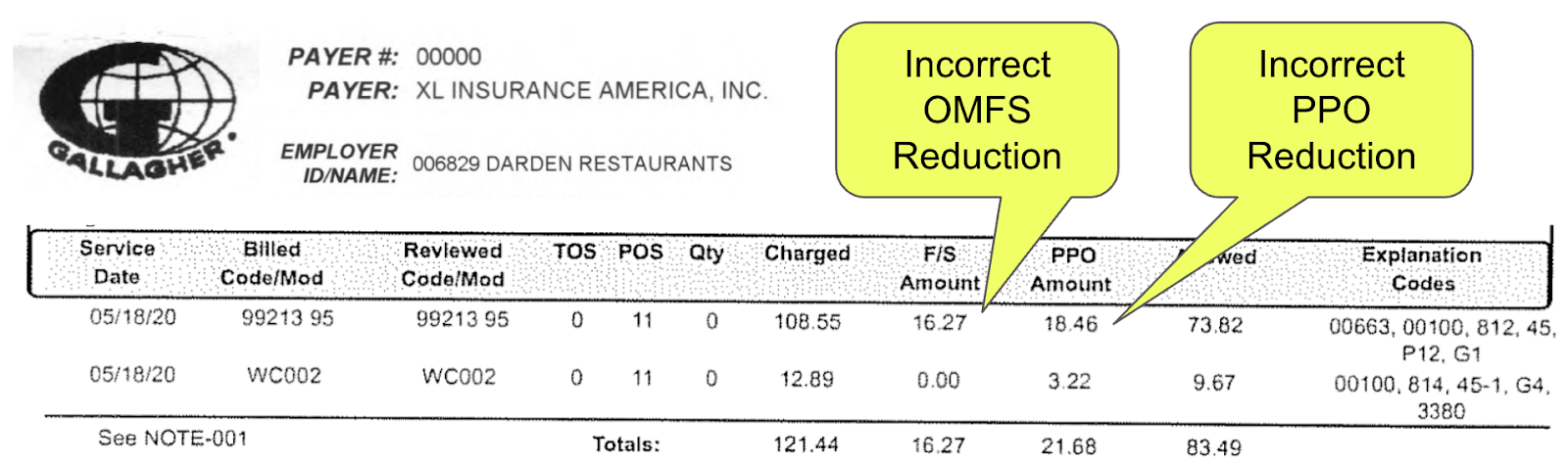 In the example below, Gallagher acting as the claims administrator for XL Insurance America, Inc. failed to properly reimburse the provider the OMFS-mandated reimbursement for a common evaluation and management code, CPT 99213.