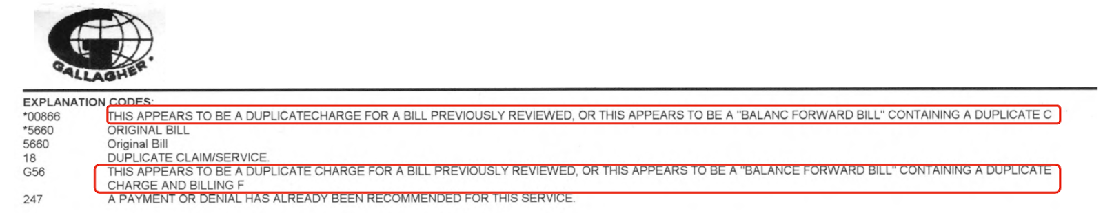 Gallagher denied the Second Review by stating the appeal was a duplicate bill. A careful reading of the explanation codes reveals that Gallagher cannot even bother to spell check or use complete sentences when responding to Second Review appeals: