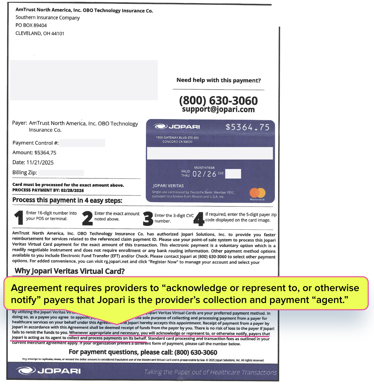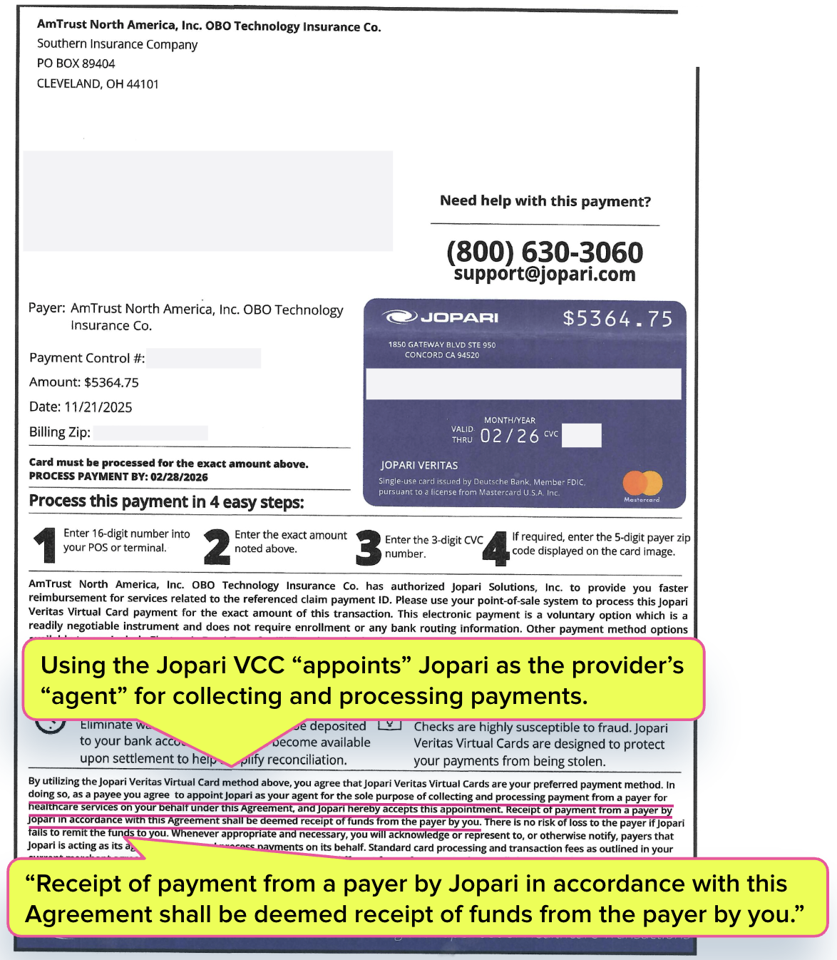 The finest print goes on to stipulate that once the provider accepts the VCC payment, the provider automatically “appoints” Jopari as the provider’s “agent” for the purpose of “collecting and processing payment from a payer for healthcare services…”