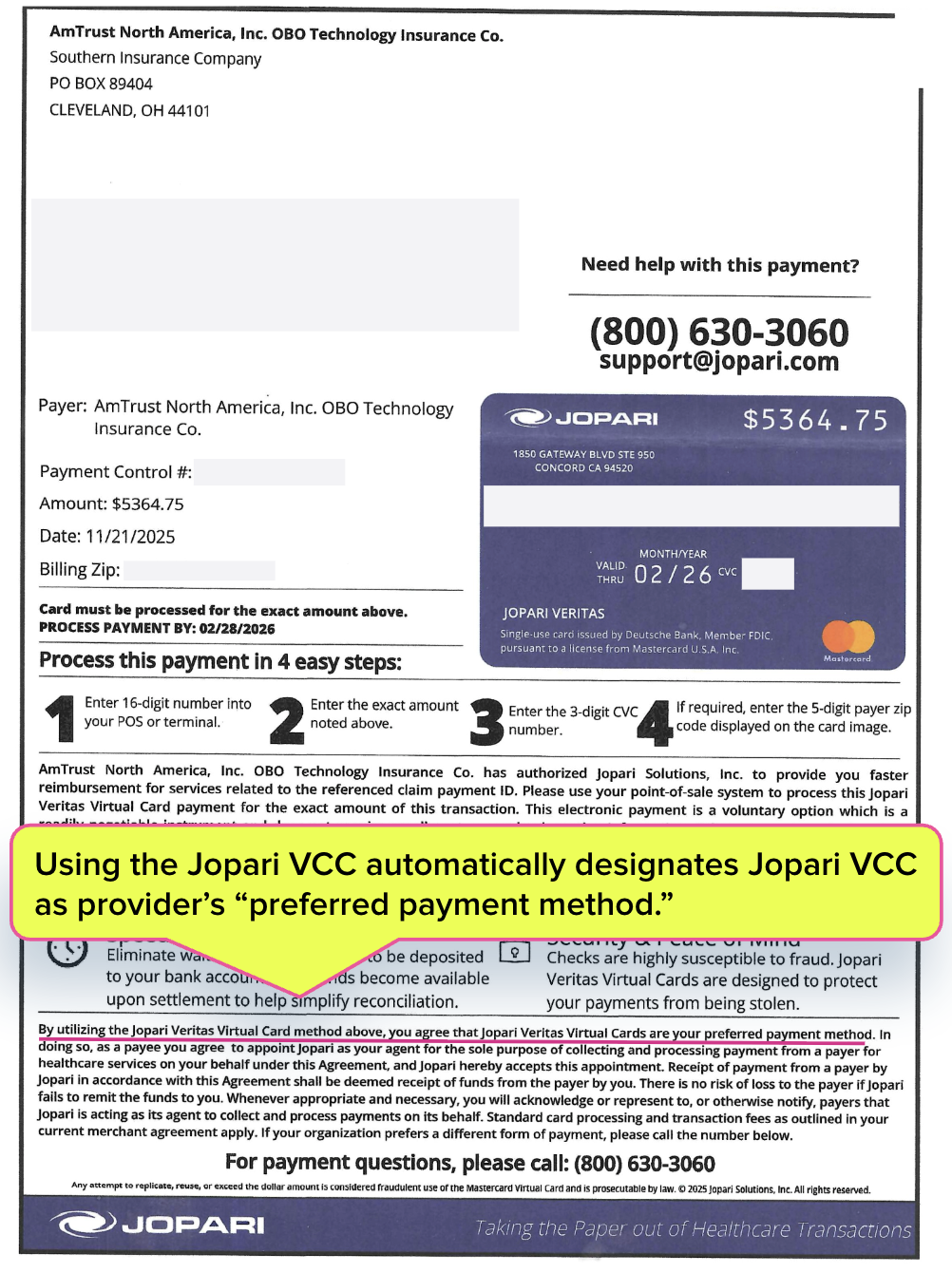 According to the document, by utilizing the VCC, the provider automatically “agrees” that the Jopari VCC is the provider’s “preferred payment method.” Presumably, this means future payments will be made via VCC.