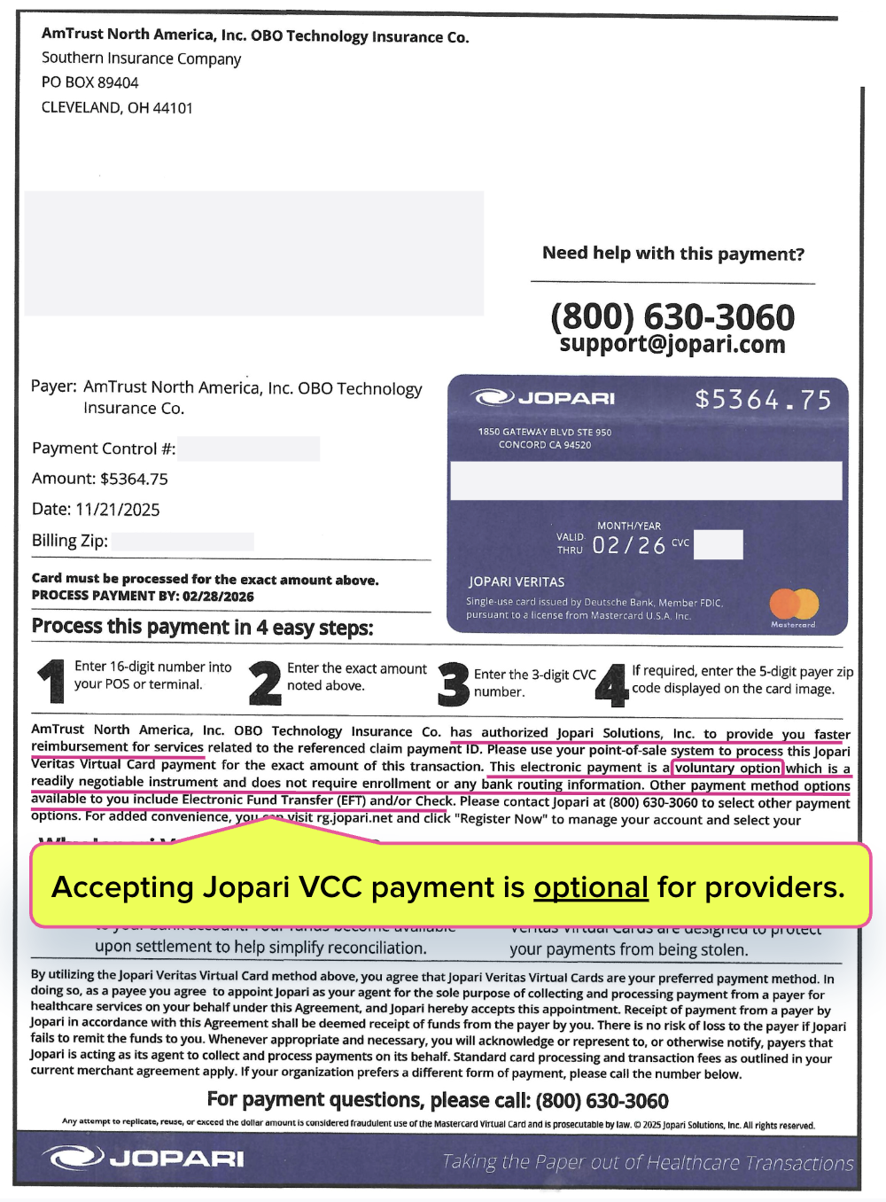 We strongly advise providers not to accept Jopari’s offer, or any other VCC payment.