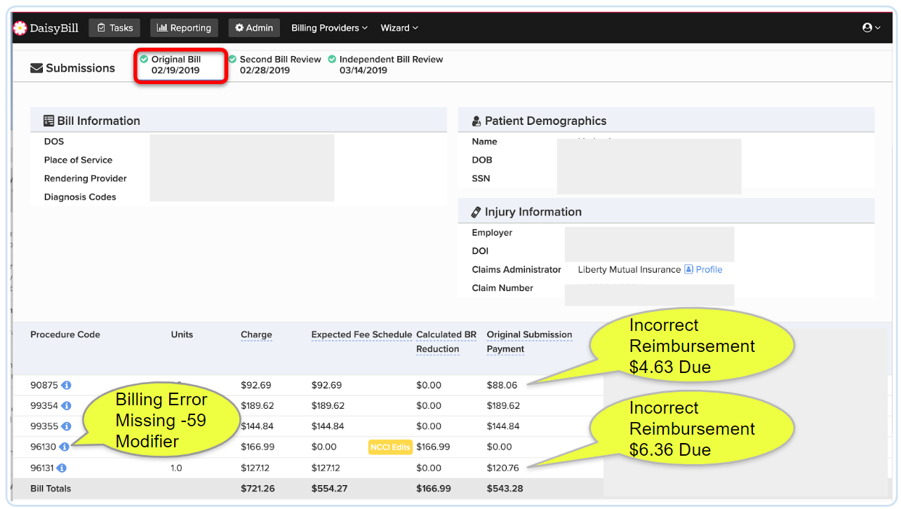 1. The tale commences on 2/27/2019 with Liberty Mutual incorrectly reimbursing two CPT codes and the provider committing a billing error by neglecting to add an appropriate modifier to one code.