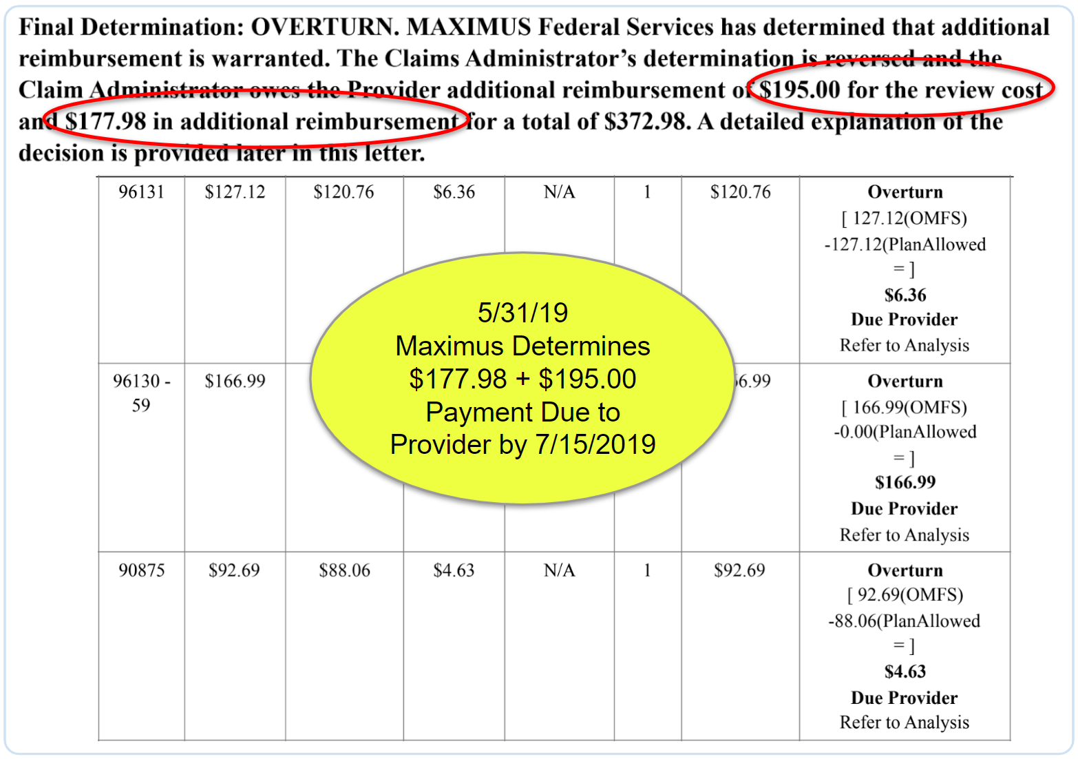 5. On 5/31/2019 Maximus rules in favor of the provider and determines Liberty Mutual owes the provider the correct reimbursement of $177.98 and the $195.00 IBR fee.