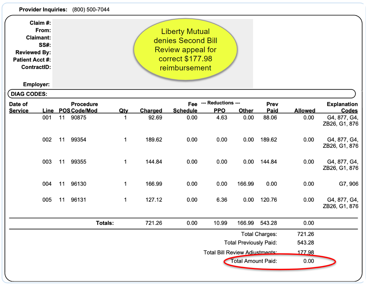 *Note to employers, regulators, and providers: the California Official Medical Fee Schedule clearly denotes the reimbursement due to the provider. By failing to correctly reimburse this provider, Liberty Mutual undermines California workers’ comp by placing the burden on the provider to pay $195 to file an Independent Bill Review to obtain the correct $177.98 reimbursement.